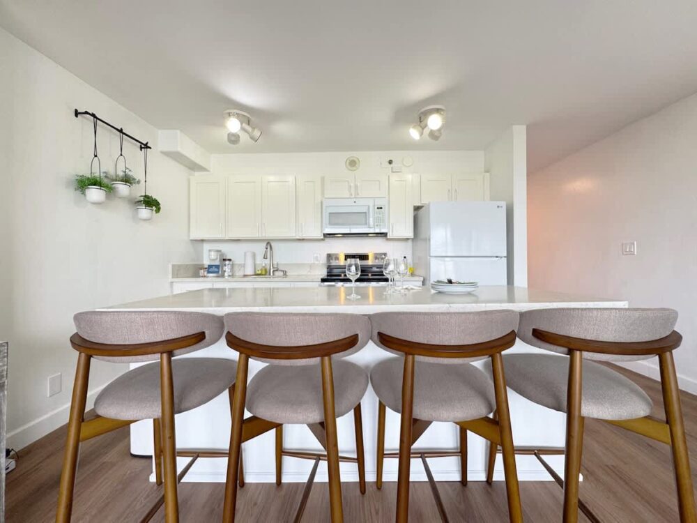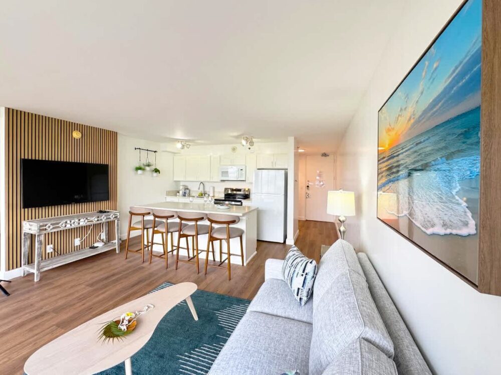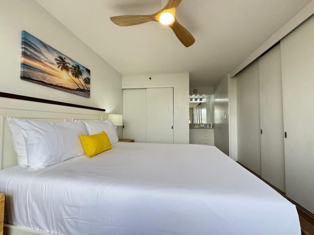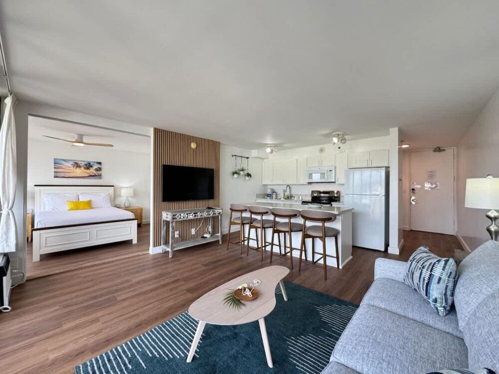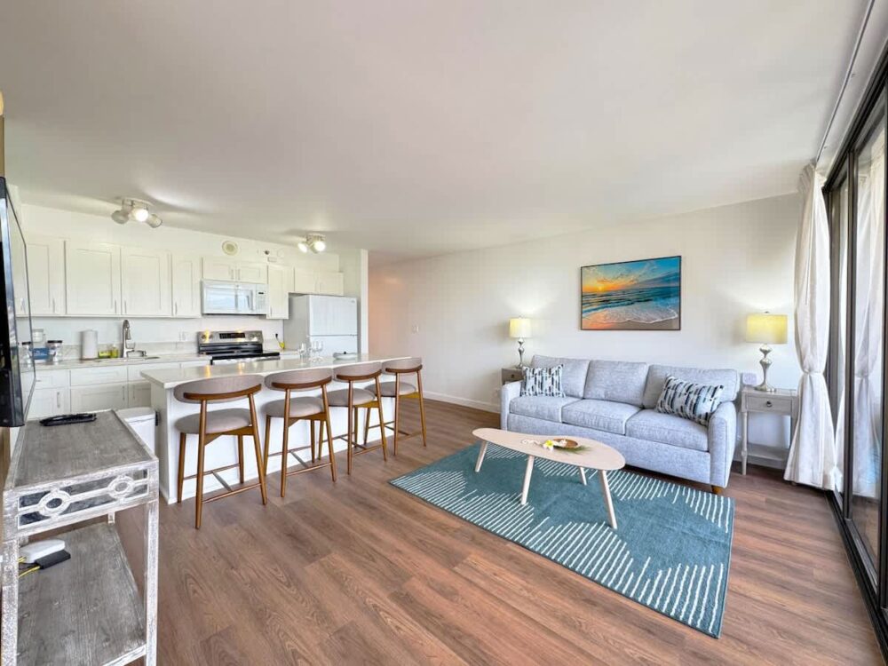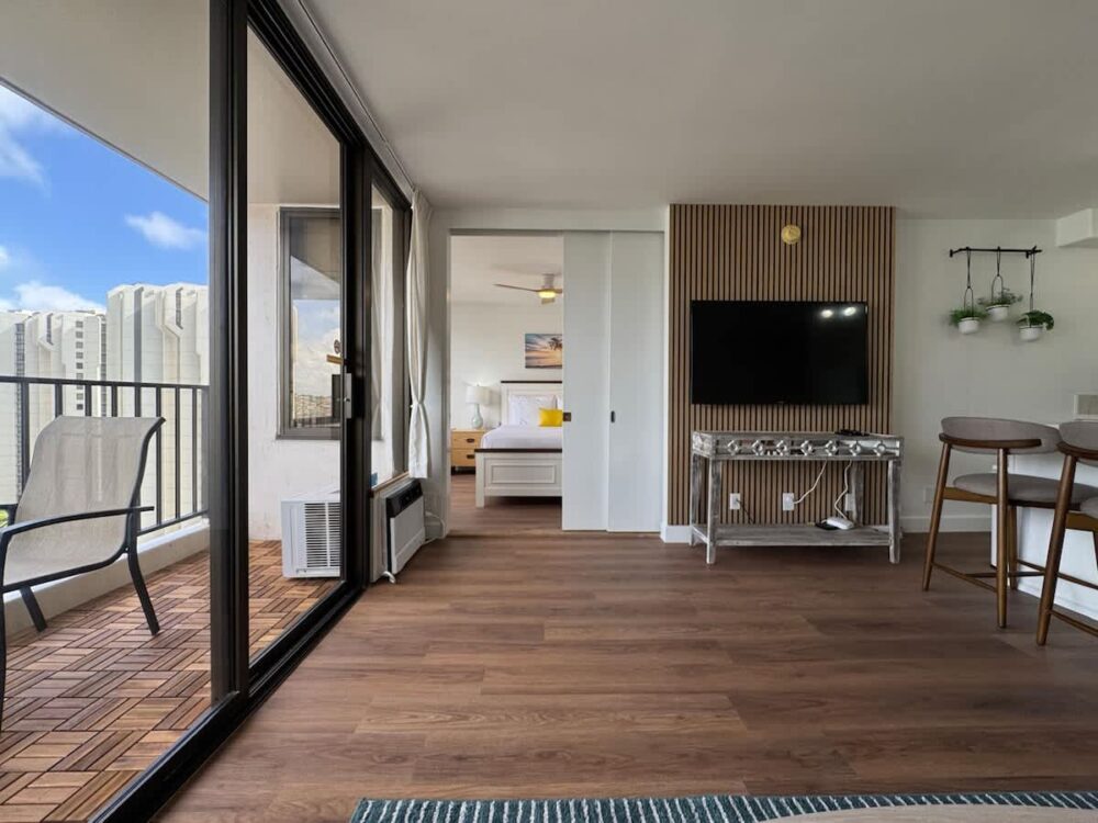 Step into this partially renovated 600 sq ft one-bedroom condo on the 18th floor of Waikiki Banyan and enjoy soothing mountain and city views that create a welcoming retreat after a day of island adventures. Just one block from world-famous Waikiki Beach, this inviting space places you within easy walking distance of dining, shopping, the Honolulu Zoo, and Kapiolani Park. The condo features a comfortable queen bed, window air conditioning, a 55-inch smart cable TV, free Wi Fi and parking, a full kitchen for easy home-style meals, and a bathroom with a tub and shower combo, making it a relaxing and convenient home base for your Waikiki getaway!