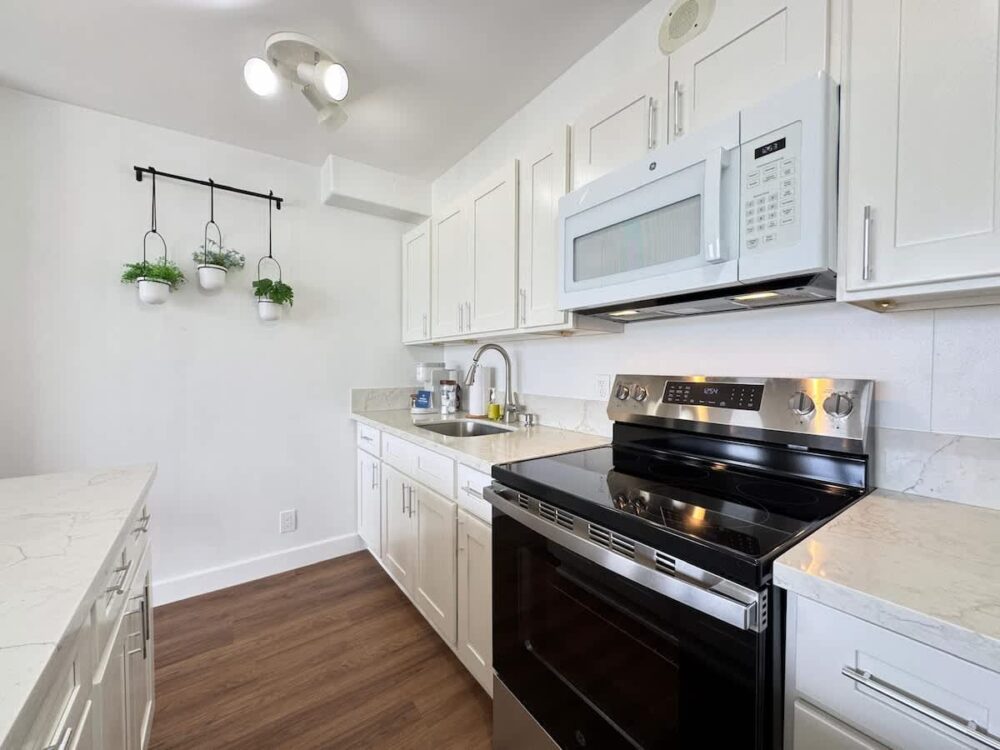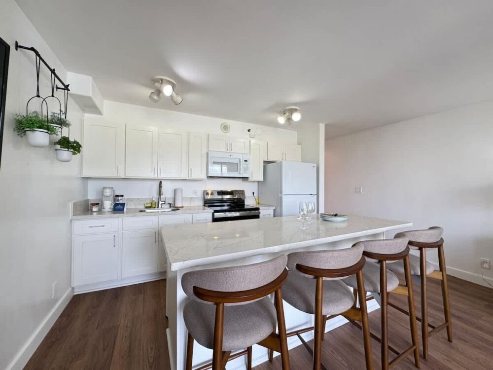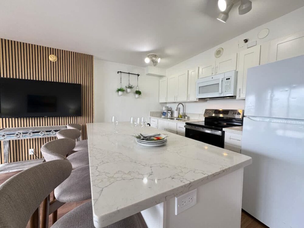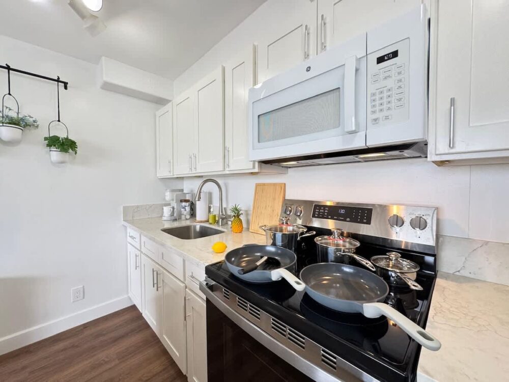 • Fully equipped kitchen with full-size appliances: microwave/range hood, stove, refrigerator with freezer.