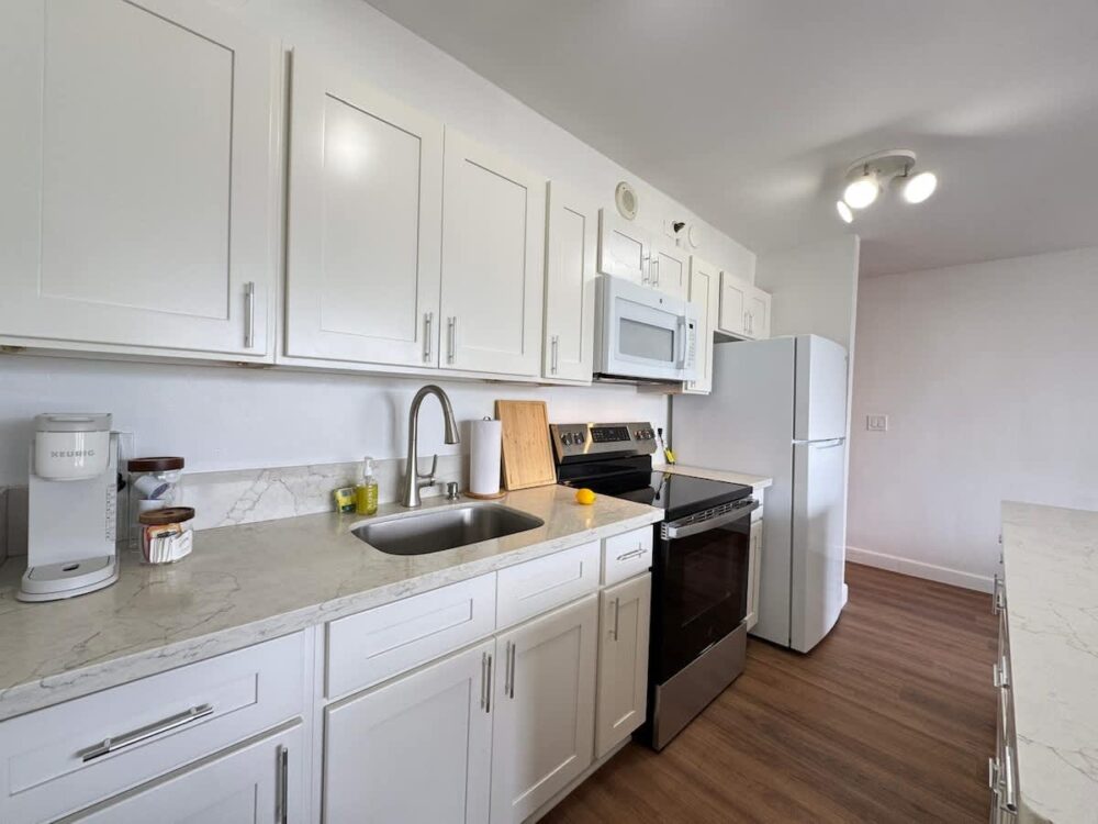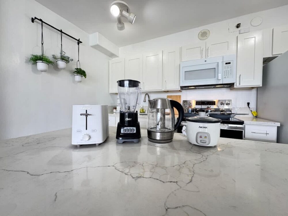 • Fully equipped with a toaster, Keurig coffee maker, rice cooker, blender, kettle, pots, pans, silverware, cookware, and dishes.