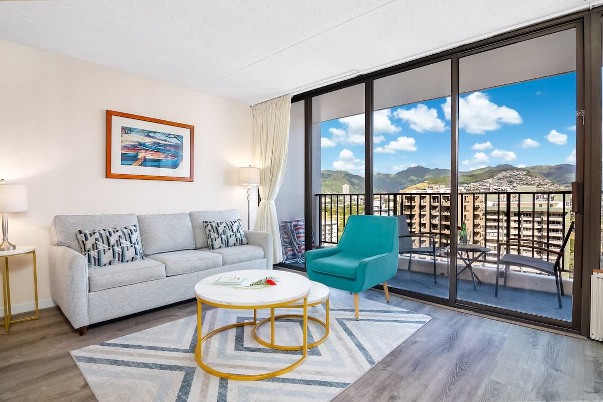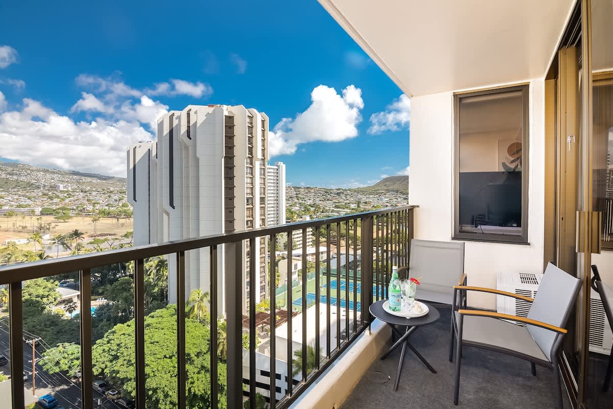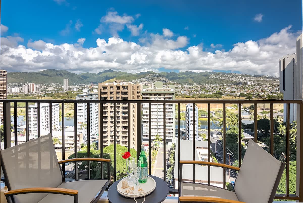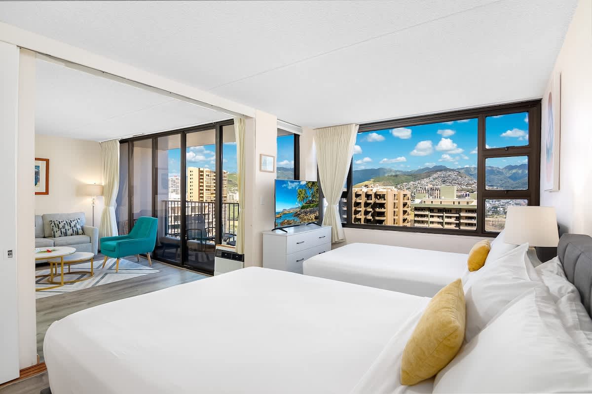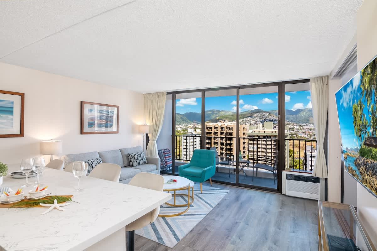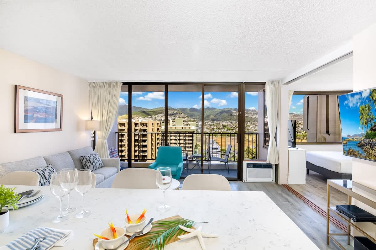 Great 1-bedroom condo at the Waikiki Banyan brought to you by Midway Vacations, perfect for up to 4 guests! You can easily stroll to the renowned Waikiki Beach, nearby shopping spots, and delightful restaurants. Enjoy complimentary high-speed wireless internet and parking during your stay and savor the stunning mountain and city views from both the bedroom and the balcony!