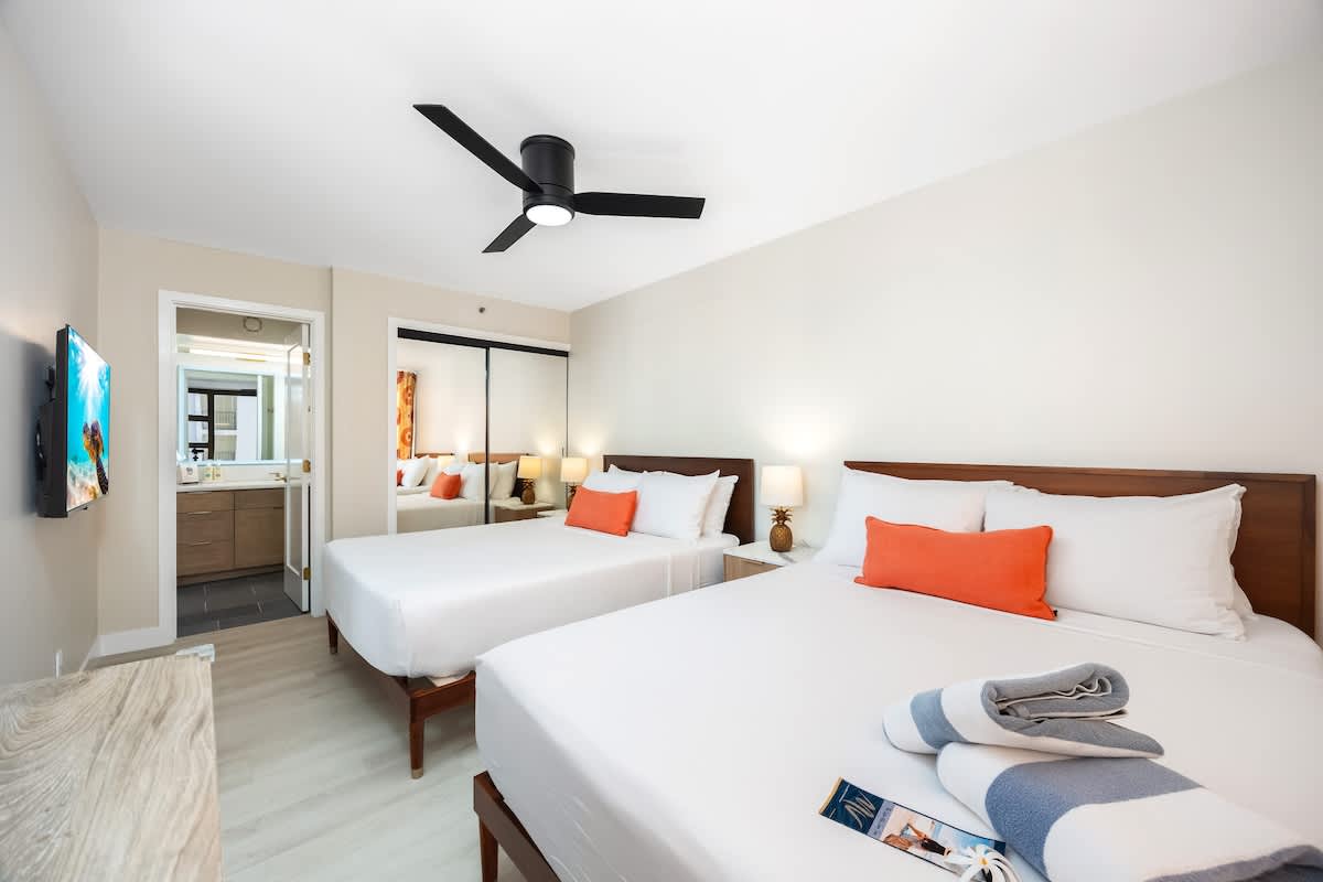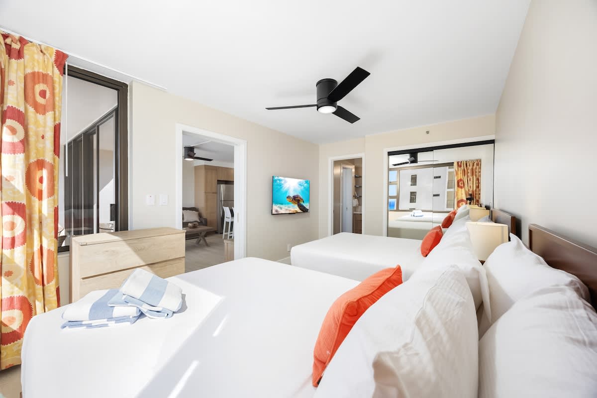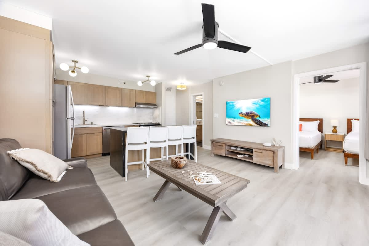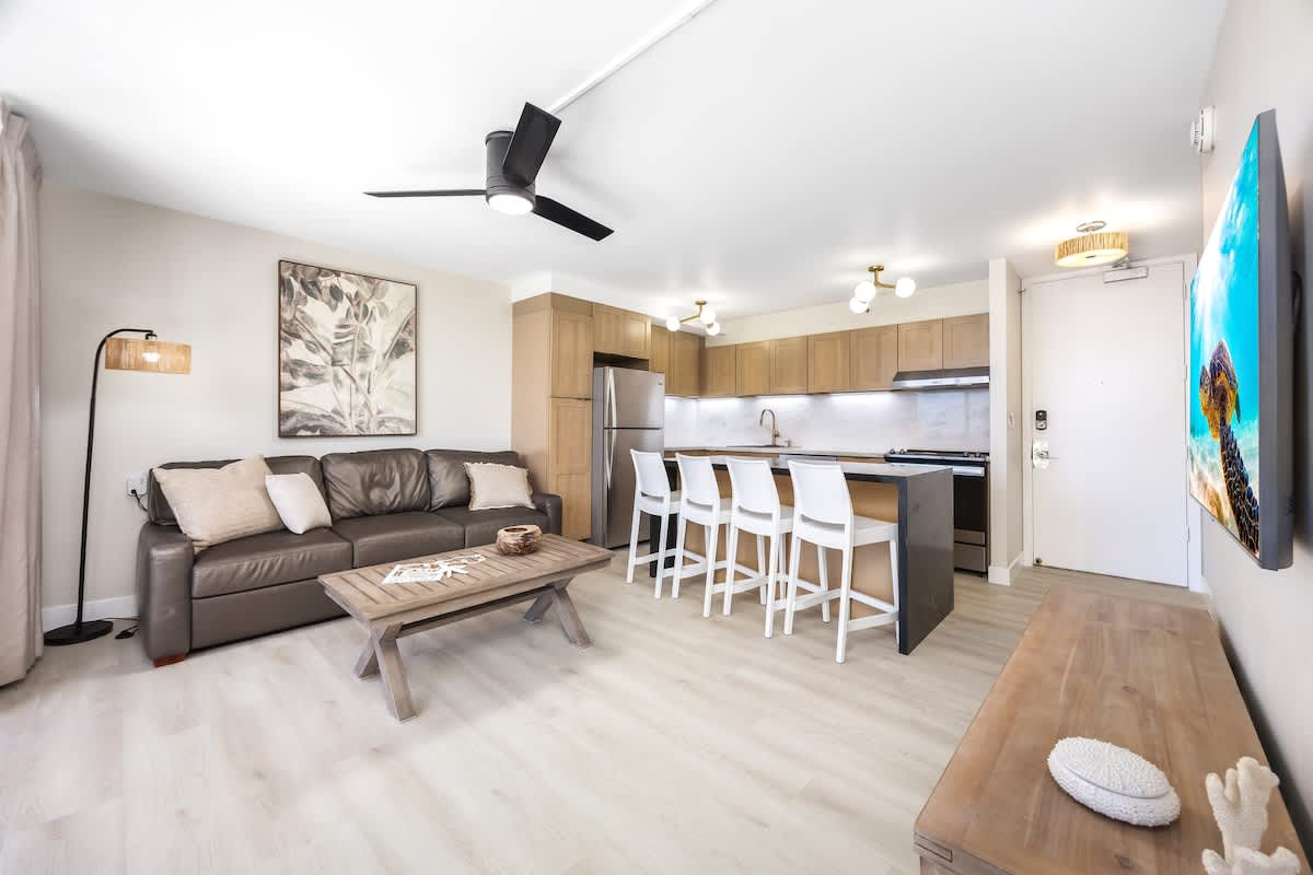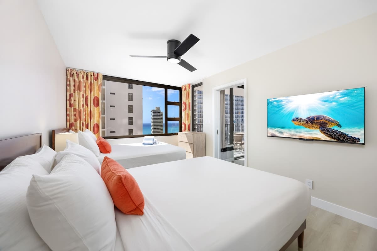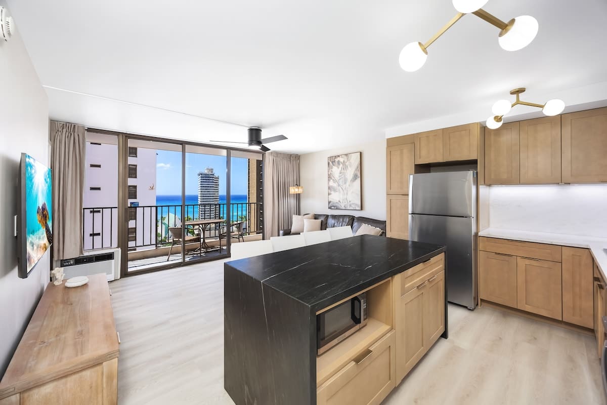 Enjoy the perfect Waikiki getaway in this NEWLY REMODELED 1-bedroom condo in Waikiki Banyan Tower 2 (Mauka), ideally located in the heart of Waikiki. Just minutes from Waikiki Beach, you can soak up the sun or take part in water activities, while nearby streets are lined with vibrant shops, restaurants, and cafés. The condo offers stunning ocean views from the living room and private balcony, a fully equipped kitchen with dining area, 2 queen beds, a sofa, and a 55″ Smart TV. Guests also enjoy free Wi-Fi and complimentary parking!
