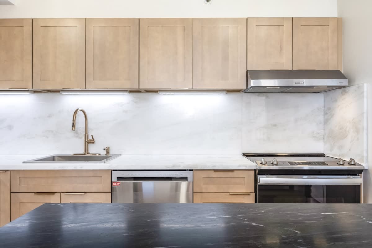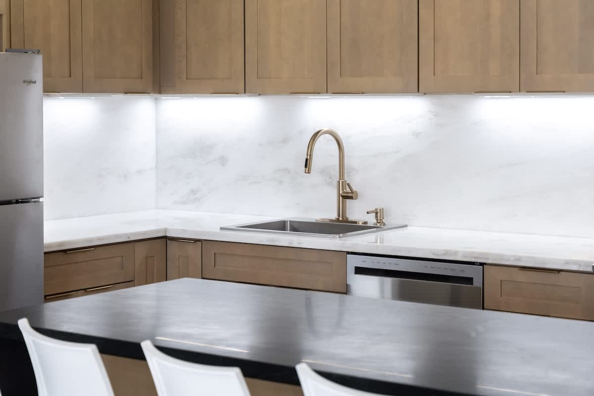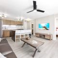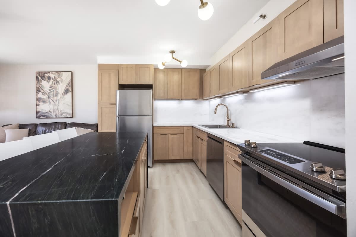 • Fully-equipped kitchen with full-size appliances: microwave/range-hood, stove, refrigerator with freezer, and dishwasher