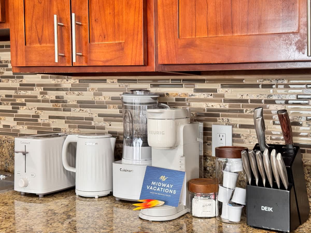 • Small appliances: toaster, Keurig coffee maker, rice cooker, blender, and kettle