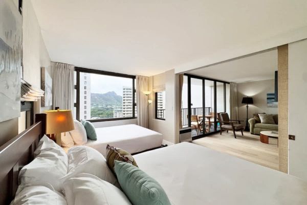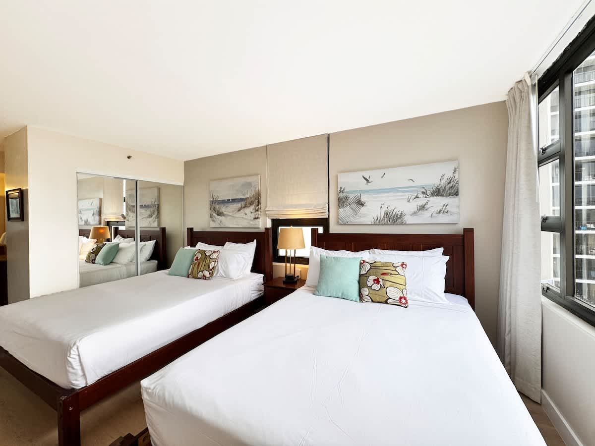 Wake up to gentle island breezes and scenic mountain views in this 600 sq ft 21st-floor 1-bedroom condo at Waikiki Banyan, ideally located just steps from world-famous Waikiki Beach. Designed for comfort and convenience, the unit accommodates up to 4 guests and features two queen beds, a sleeper sofa, a window AC, a 43″ LG Smart Cable TV, a full kitchen, and a full bathroom with a walk-in shower. Free Wi-Fi and parking are included, with shopping, dining, and Waikiki attractions all within easy walking distance!