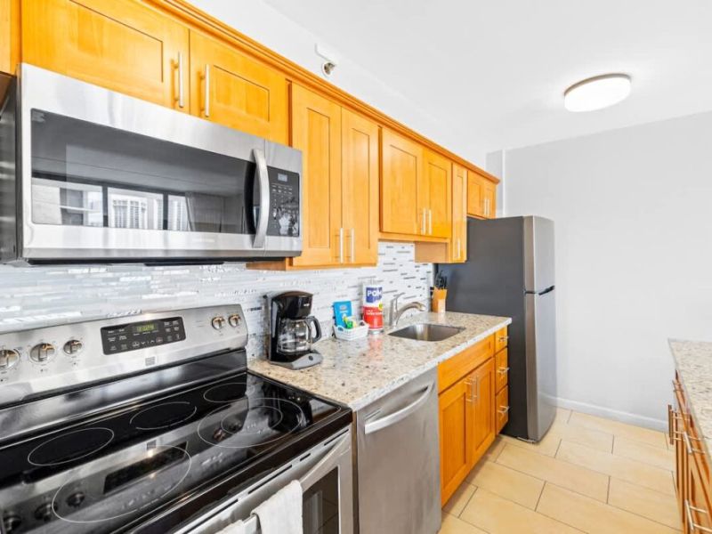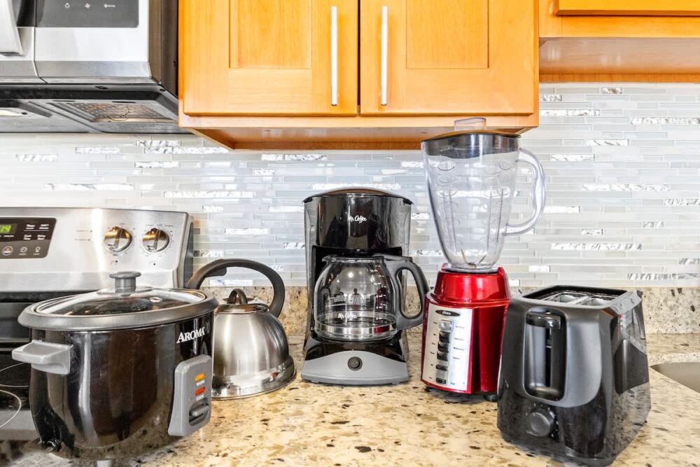 • Fully equipped with a toaster, coffee maker, rice cooker, blender, kettle, pots, pans, silverware, cookware, and dishes.