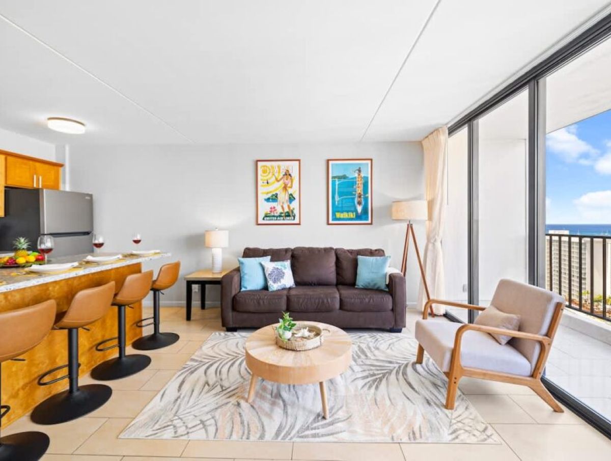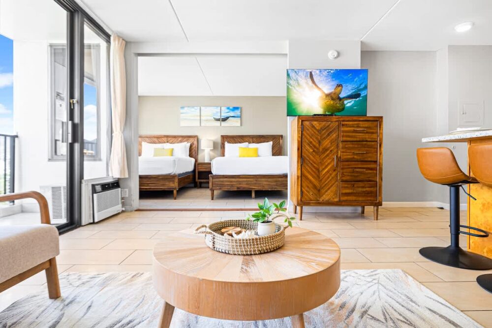 Enjoy a relaxing escape at Waikiki Banyan Tower 1 in this beautiful 1-bedroom condo for up to 4 guests, perfectly located in the heart of Waikiki. Take in beautiful ocean views from the living room, bedroom, and balcony, and walk just minutes to world-famous Waikiki Beach. This unit has an interior area of 533 sq ft plus a 67 sq ft lanai. It features an open layout with a fully equipped kitchen, 2 queen beds, a sleeper sofa, a 50″ Smart TV, and a full bathroom, plus provided linens, beach towels, free high-speed Wi-Fi, and free parking for a comfortable and memorable Hawaiian getaway!