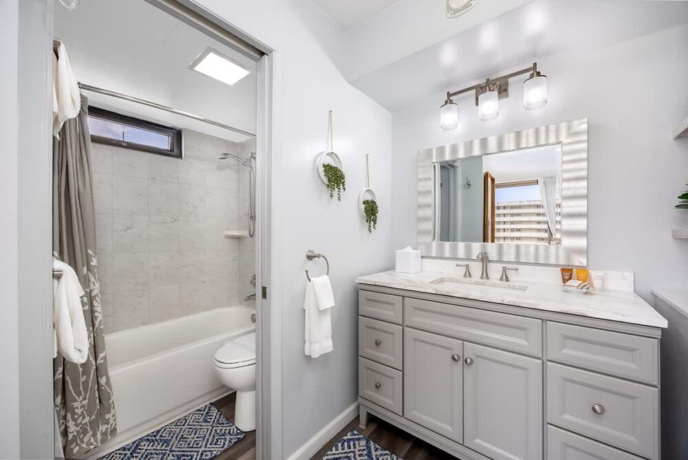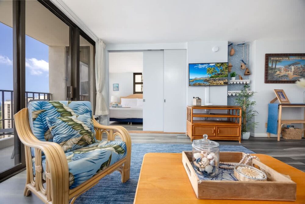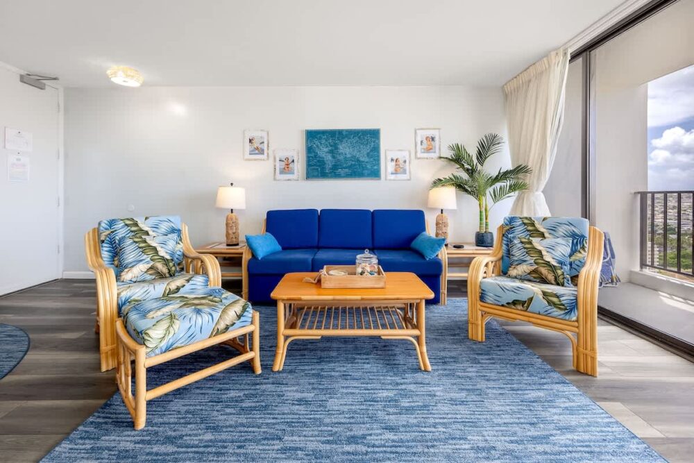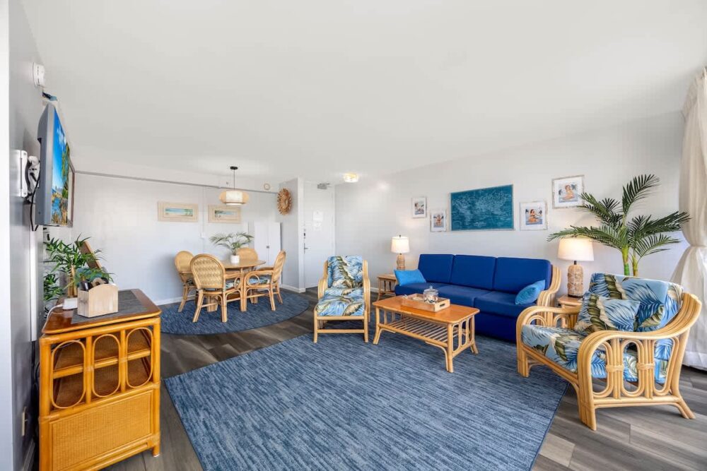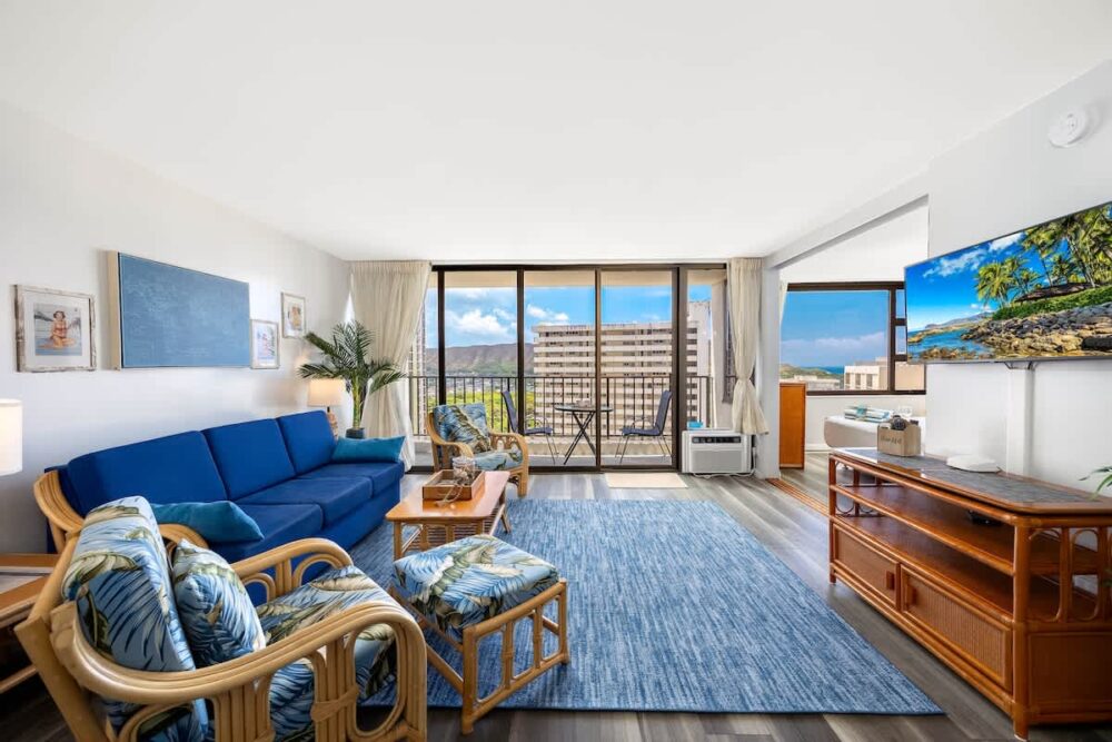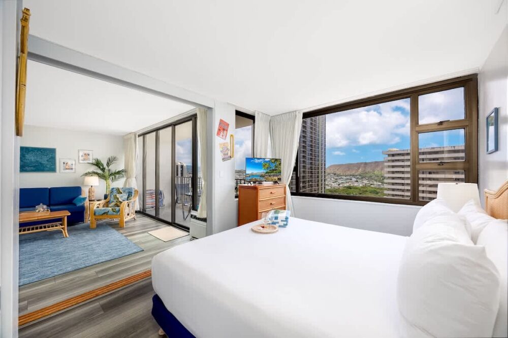 Step inside and relax in a comfortable space offering beautiful views of Diamond Head, the city skyline, and a peek of the ocean from your private lanai. The bedroom features a king-size bed and a 32″ flat-screen TV with Roku, while the living area includes a queen-size pull-out sleeper sofa and a 43″ Smart TV—perfect for relaxing after a day out. You’ll also enjoy a fully equipped kitchen, a dining table for four, and a bathroom with a tub/shower combo and bright vanity—everything you need for a hassle-free stay.