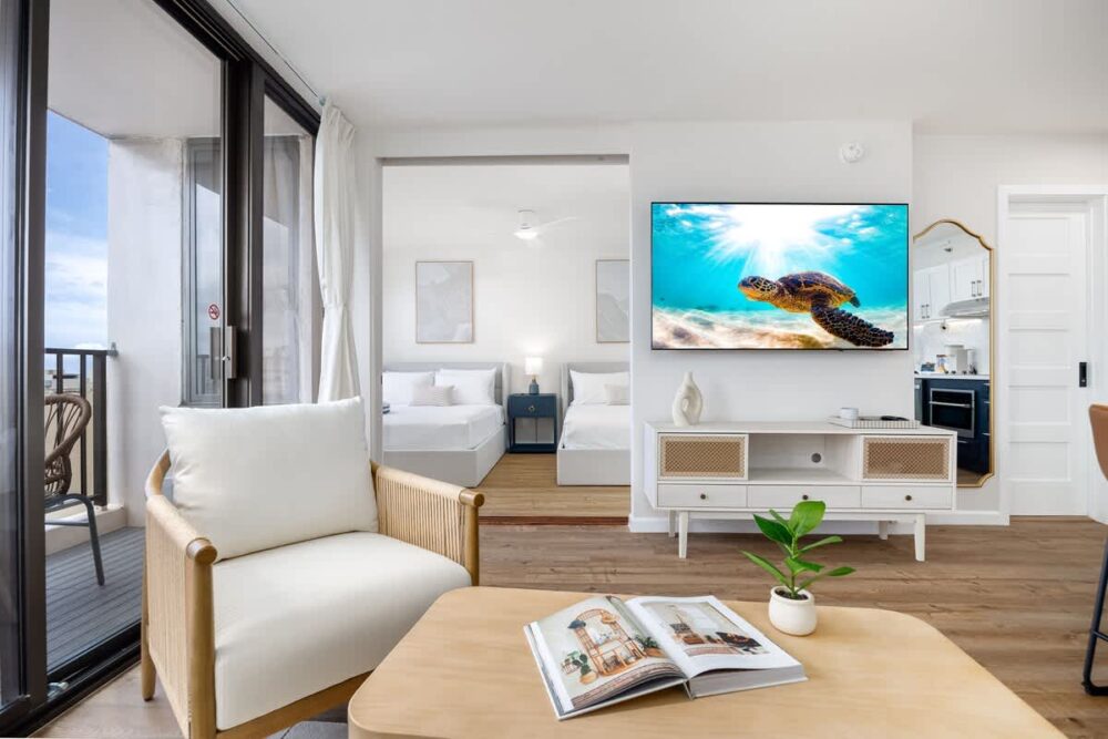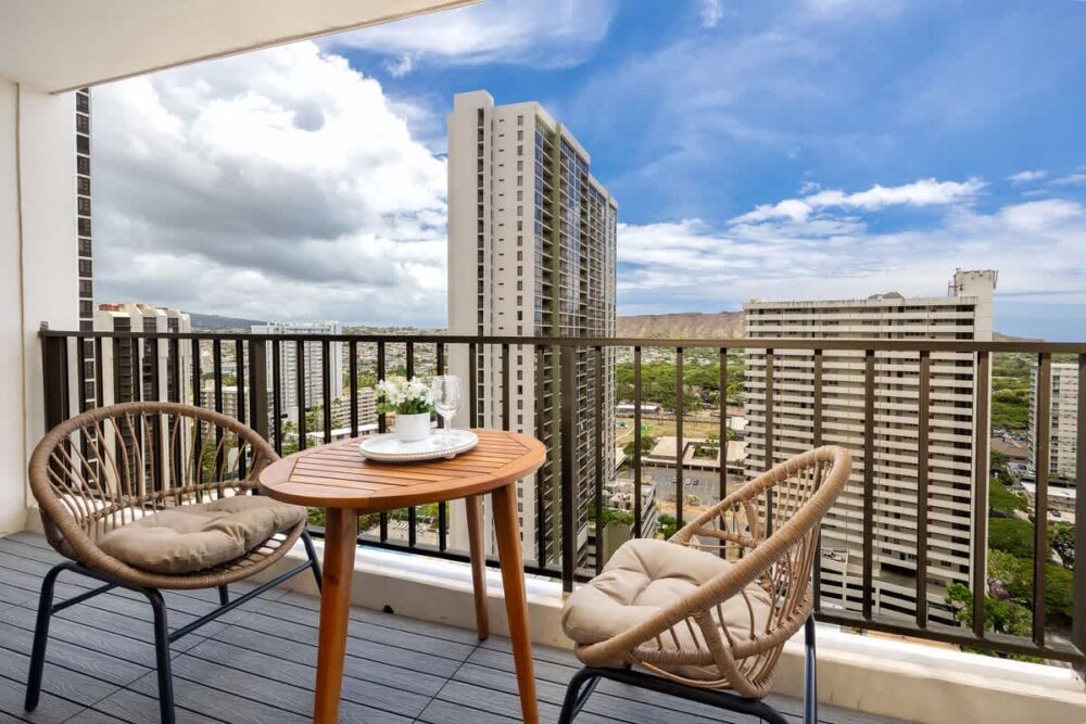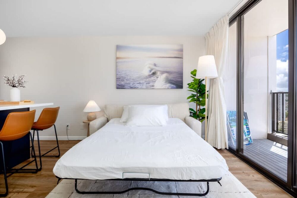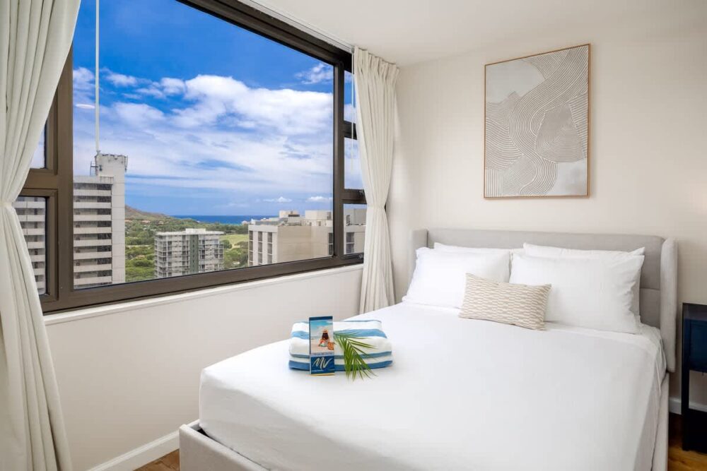 Enjoy your stay in this newly renovated 600 sq ft condo on the 24th floor of Waikiki Banyan Tower 1, ideally located in the heart of Waikiki just steps from world-famous Waikiki Beach, shops, dining, and entertainment. This retreat features Diamond Head, city, and partial ocean views from the private lanai, a bedroom with queen and full beds, a sleeper sofa, Smart TVs, a full kitchen, dining bar, and a full bath, plus free WiFi, parking, and beach gear for a relaxing Hawaiian escape!