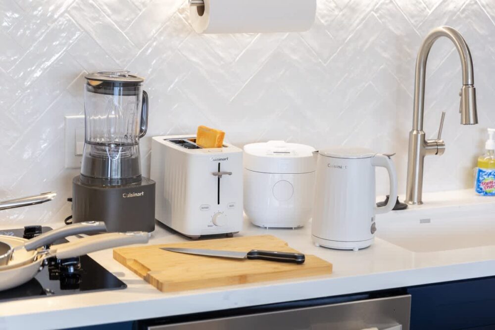 • Fully equipped with a toaster, Keurig coffee maker, rice cooker, blender, electric kettle, pots, pans, silverware, cookware, and dishes.