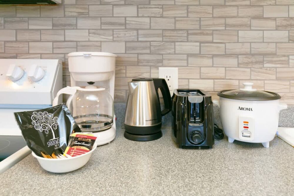 – Fully equipped with a toaster, coffee maker, rice cooker, blender, kettle, pots, pans, silverware, cookware, and dishes.