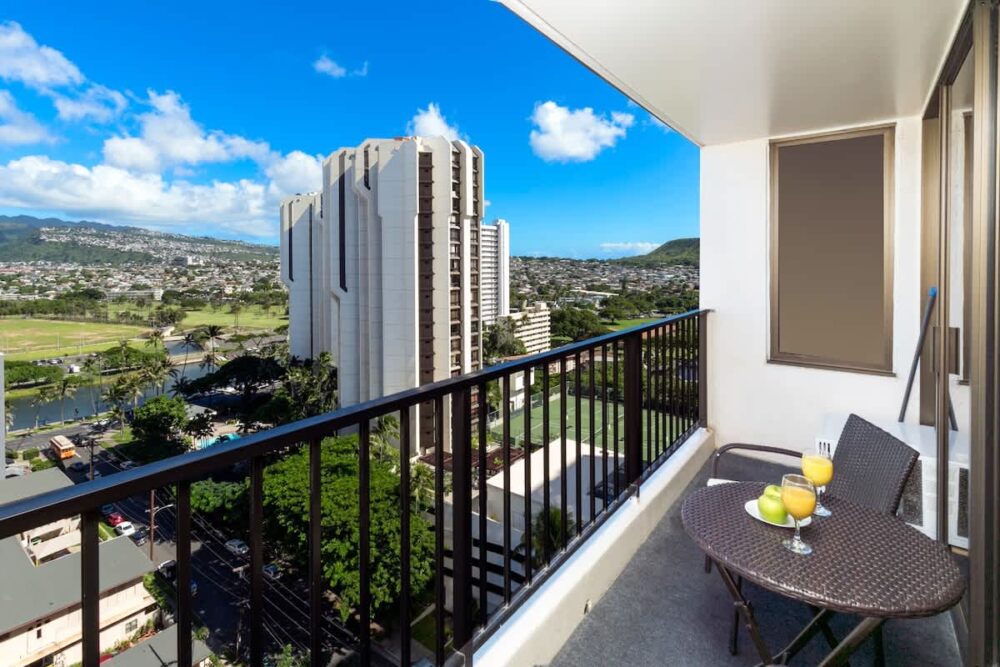 Situated on the 24th floor, you’ll relish breathtaking mountain and city views from your living room, bedroom, and private balcony. And did we mention it’s just a stroll away from the pristine Waikiki beach? It’s a traveler’s dream come true!