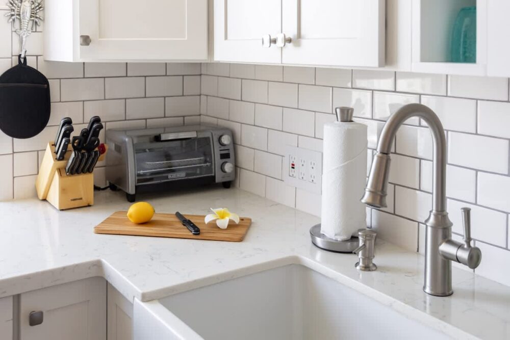 – Quartz countertop, vanity with cabinet