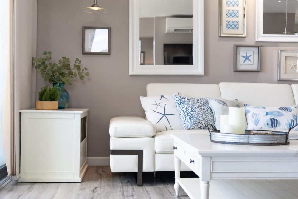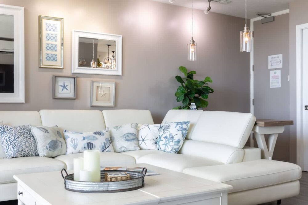 In addition to the sofa, the living room boasts a 55″ smart TV and versatile adjustable tables.