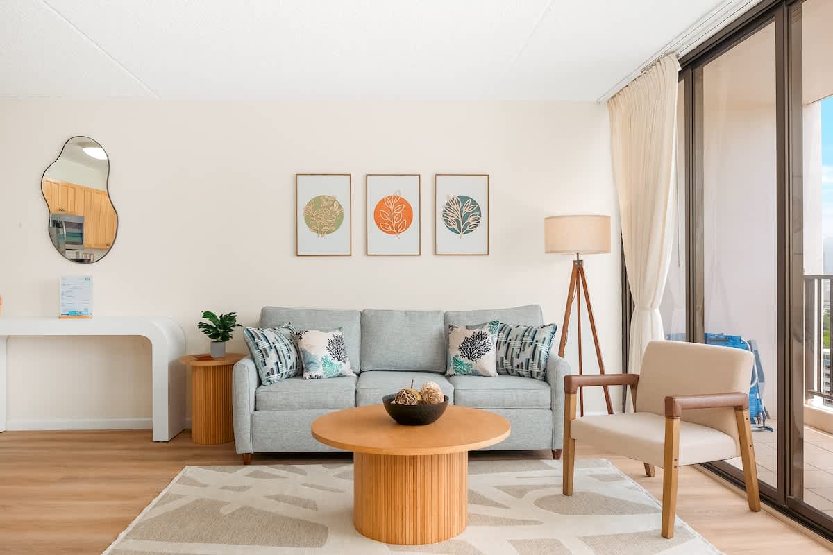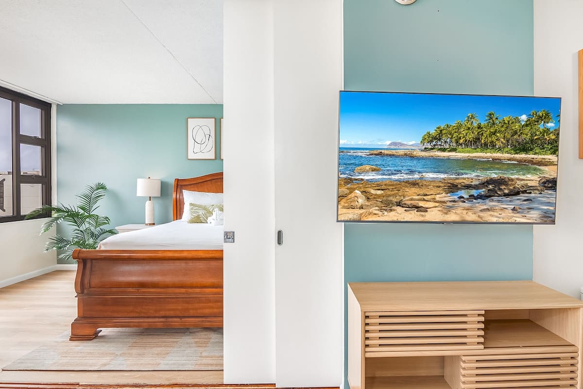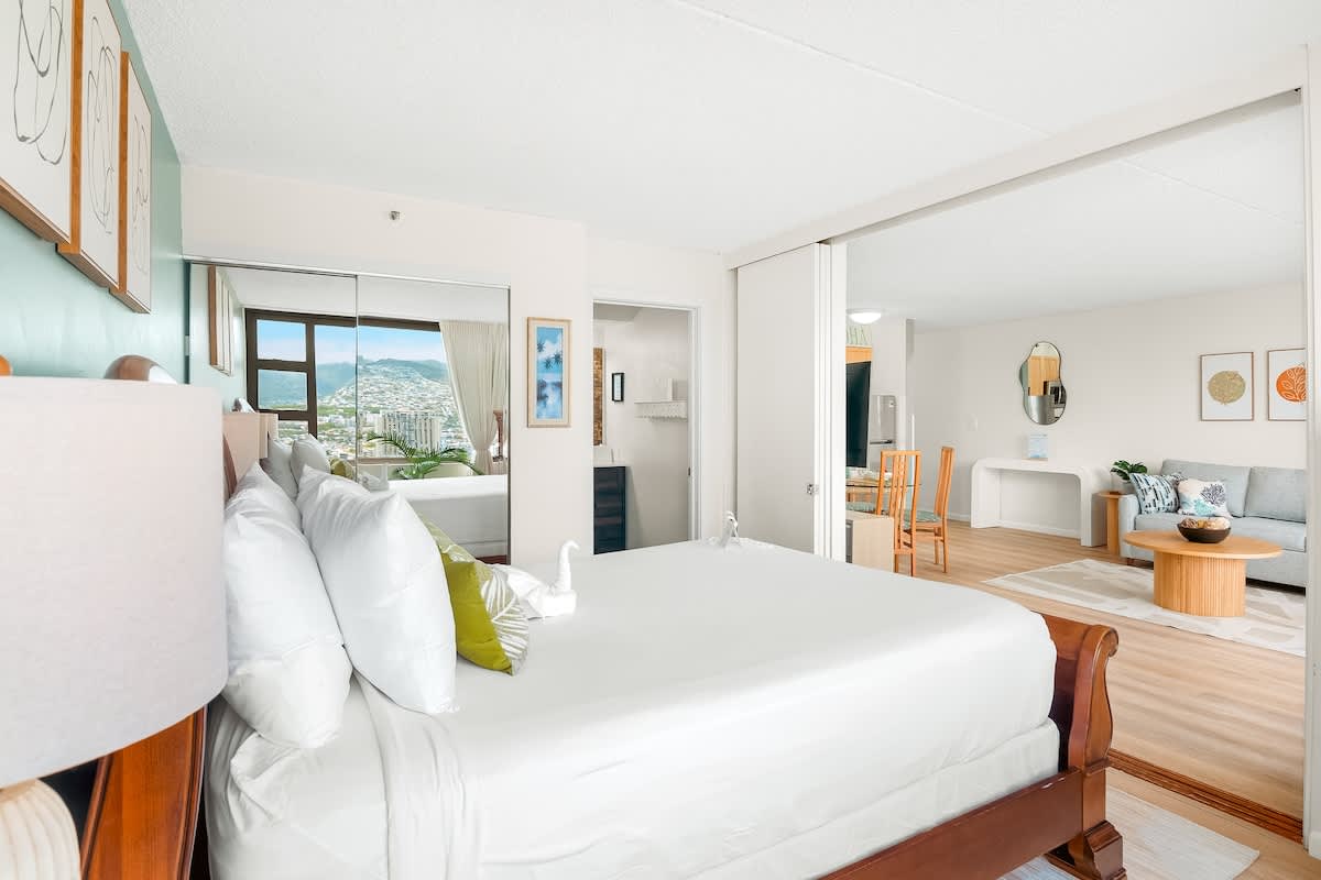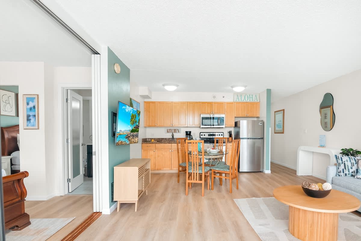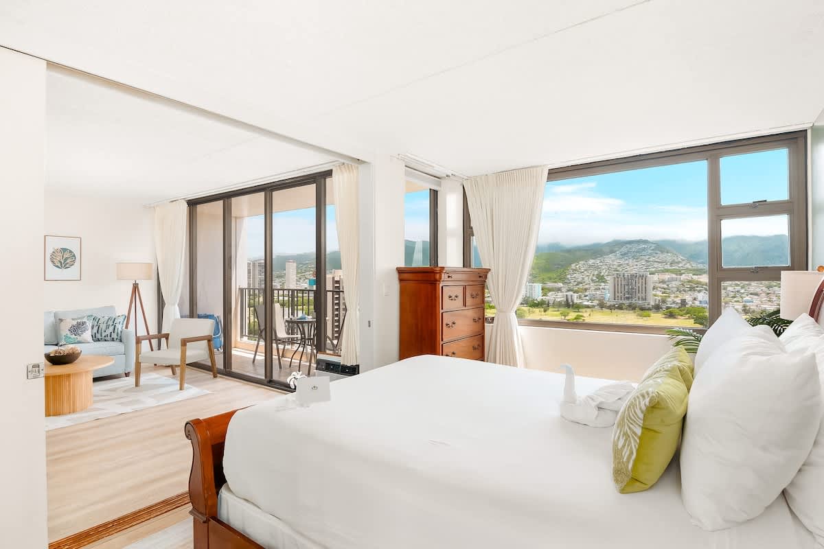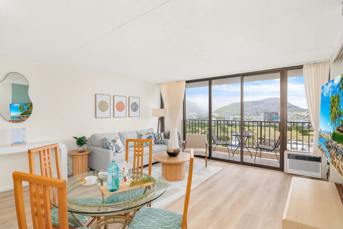 Discover this 1-bedroom condo in Waikiki Banyan Tower 2 (Mauka), just minutes away from the famous Waikiki Beach. This condo is the perfect retreat for families and friends looking for a cozy and convenient stay in Hawaii. Enjoy stunning mountain views from the living room, bedroom, and balcony, where you can relax and take in the beauty of the surroundings. The condo features a 50” Samsung smart TV, a pull-out sleeper sofa in the living room for entertainment, and a fully equipped kitchen with full-size appliances, making it easy to unwind and prepare meals. The bedroom offers a comfortable queen-size bed for a restful night’s sleep, and the bathroom includes a tub and shower combo for added convenience. Step out onto the balcony with a table and 2 chairs, perfect for enjoying a meal or a drink while admiring the mountain and city views.