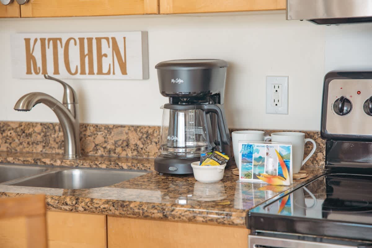 – Your very own Aloha Pack: coffee filters, salt and pepper, laundry detergent, dish soap and sponge, hand soap, shampoo/body wash/lotion set, toilet paper, paper towels, tissues, and cleaning supplies.