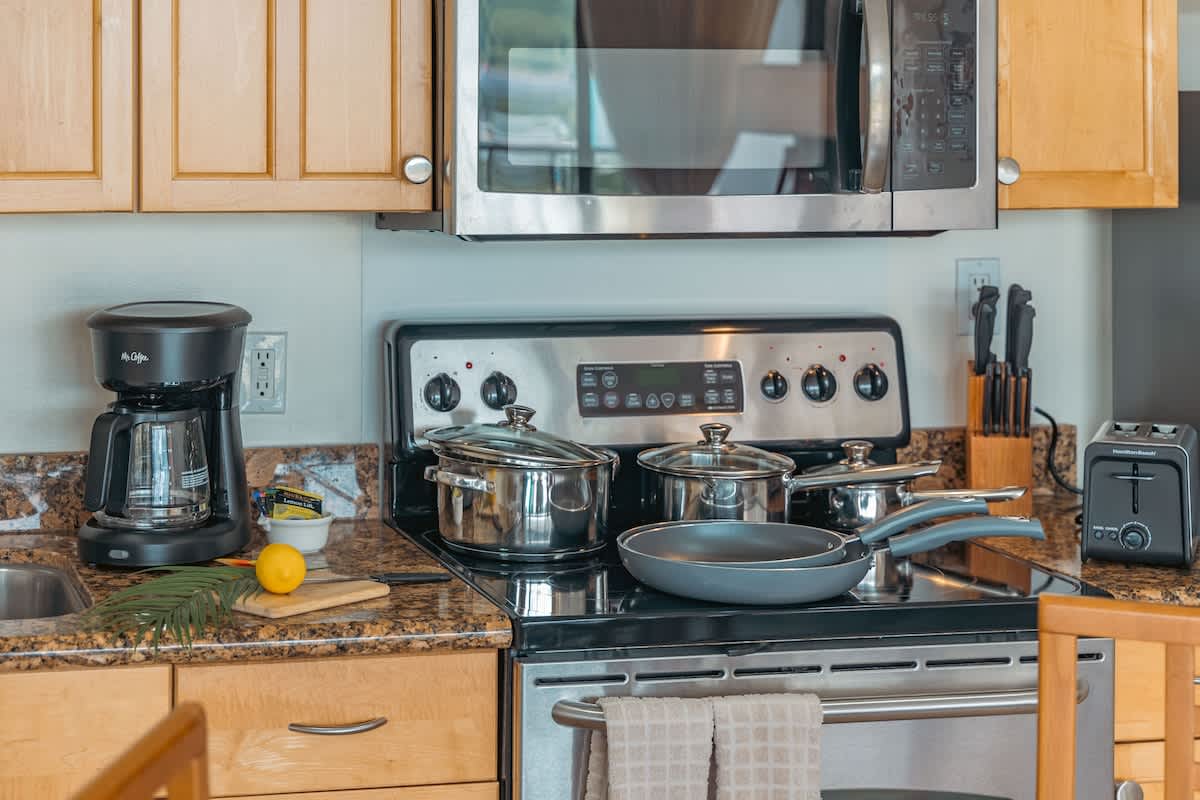 – Fully-equipped kitchen with full-size appliances: microwave/range-hood, stove, and refrigerator with freezer.