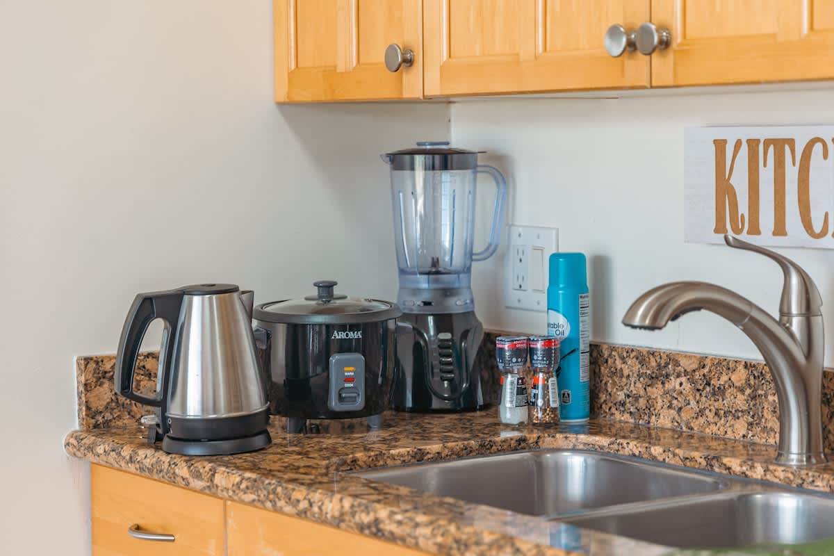 – Fully equipped with a toaster, coffee maker, rice cooker, blender, kettle, pots, pans, silverware, cookware, and dishes.