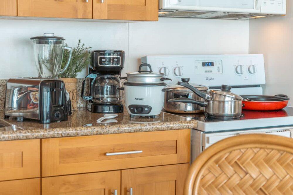 – Fully equipped with a toaster, coffee maker, rice cooker, blender, kettle, pots, pans, silverware, cookware, and dishes.