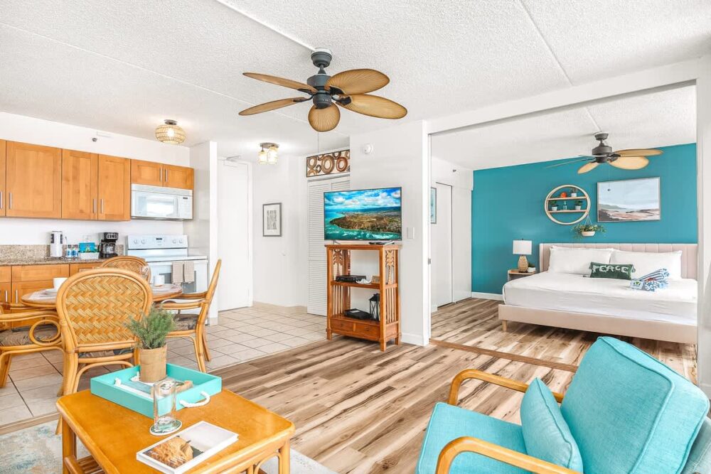 The well-equipped kitchen and dining area with a table and 4 chairs make mealtime convenient. In the bedroom, find a king-size bed plus a great ocean view. Unwind in the living room with a pull-out sleeper sofa, a new accent chair, and a 42″ Smart TV. The Lanai balcony offers incredible views of the city, a recreation deck, and a stunning ocean view! Plus, a full bathroom with a shower/tub combination completes this cozy unit.