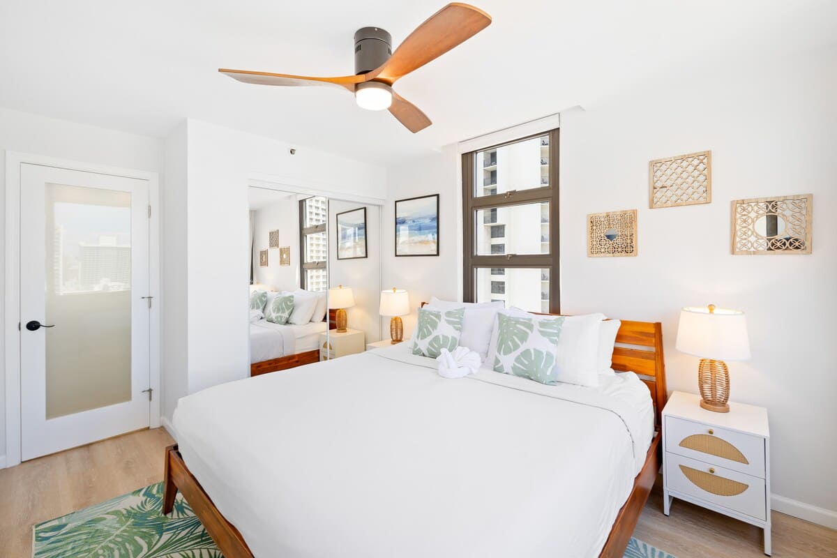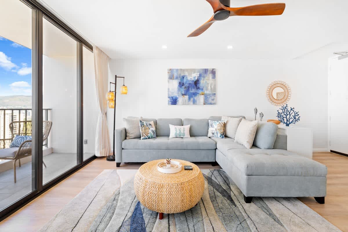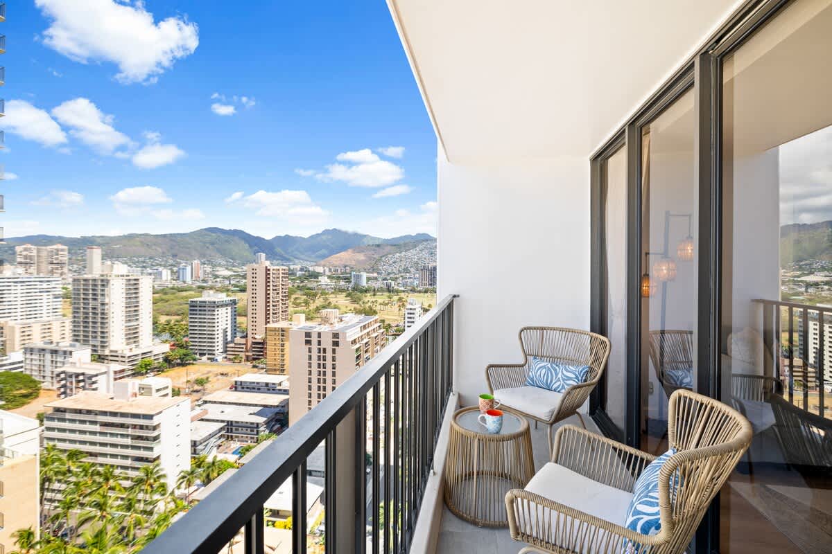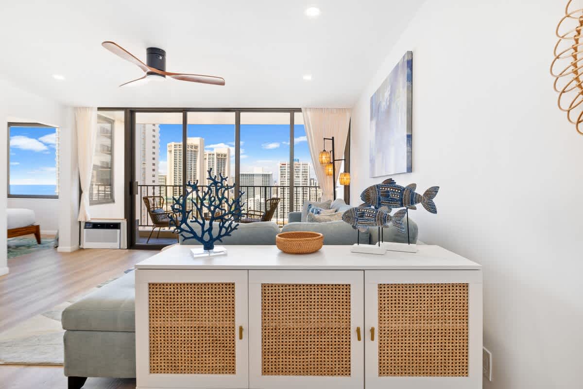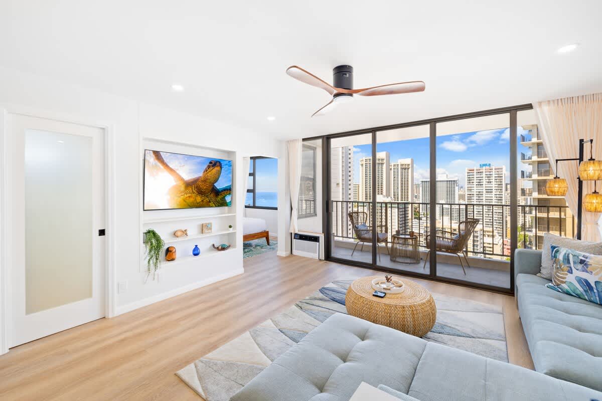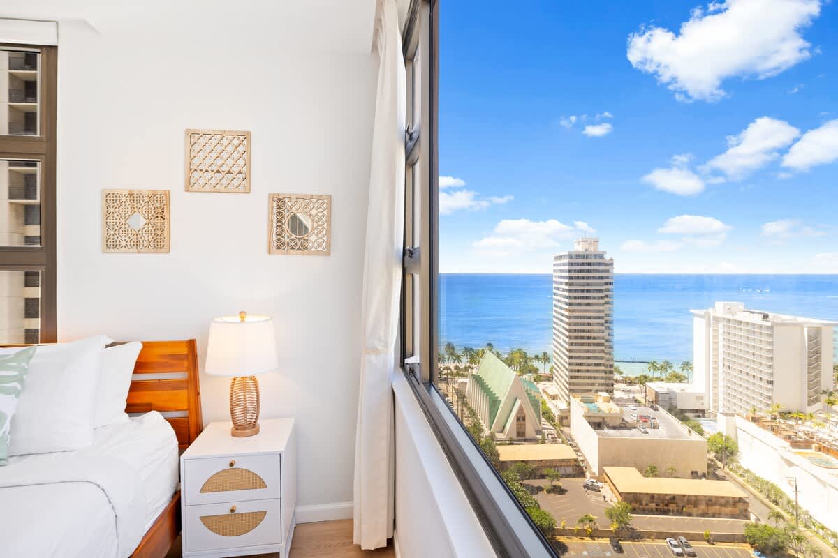 This 25th-floor 1BR at Waikiki Banyan with FREE parking offers stunning Ocean views from the private lanai, just 1 block from Waikiki Beach. Sleeps 4 with a king bed, queen-size sofa bed, full kitchen, and A/C living room. Walk to restaurants, shops, and attractions. Enjoy high-speed Wi-Fi and beach gear — all cared for by Midway Vacations for a clean, relaxing, and unforgettable stay.