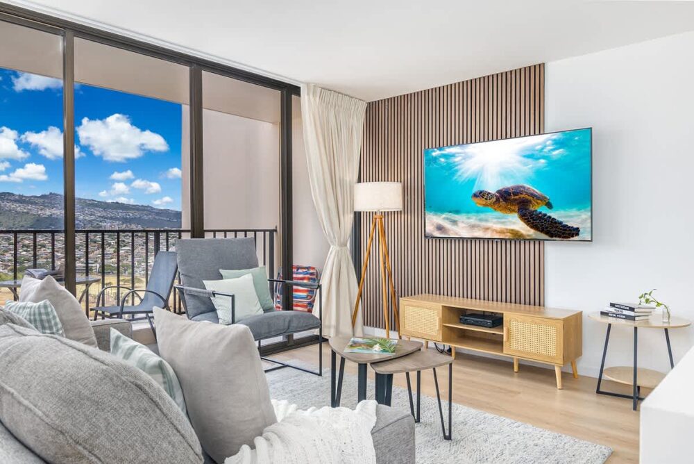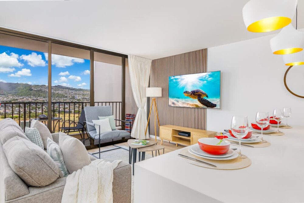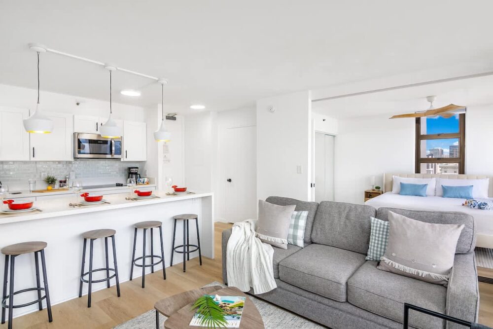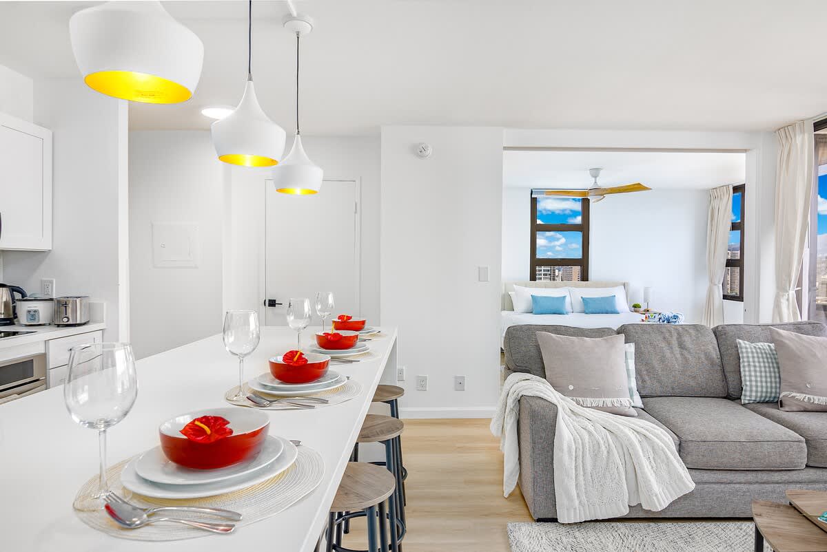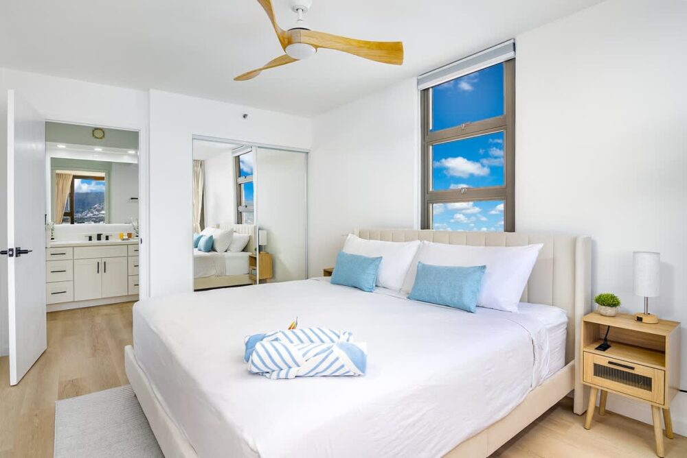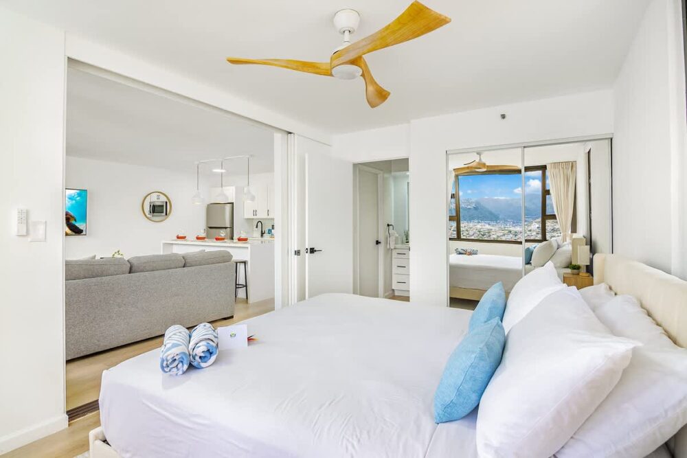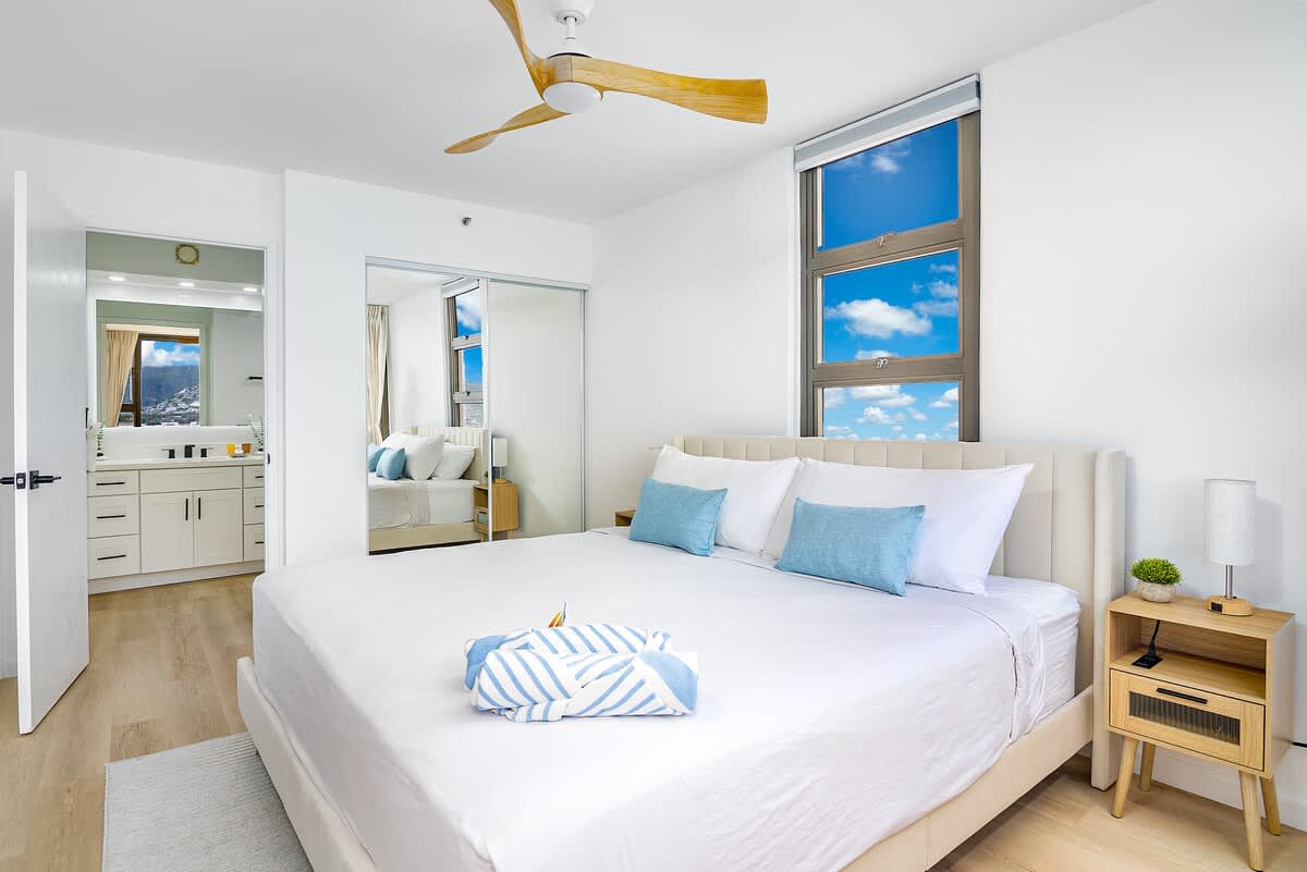 Step into paradise at this 26th-floor Waikiki Banyan condo, just one block from the beach! Enjoy stunning mountain and city views from your private balcony, unwind in a king bedroom, or relax in the living area with a sleeper sofa and 65″ smart TV. With a fully equipped kitchen, dining for 4, a walk-in shower, air conditioning, and an unbeatable location near shops and dining, this stylish retreat blends comfort and convenience for your perfect Waikiki getaway!