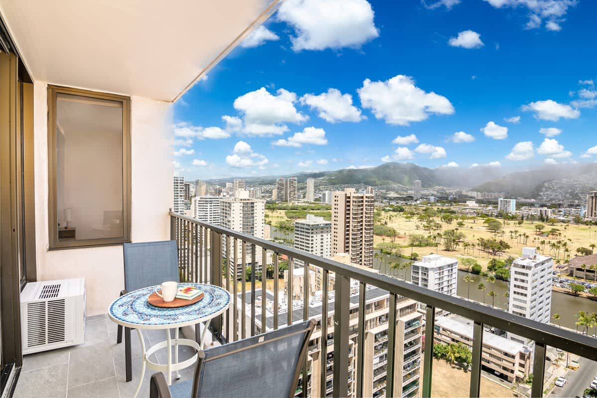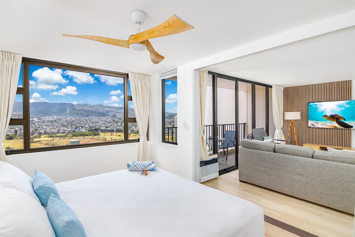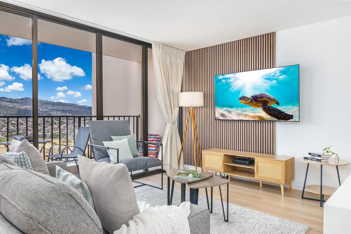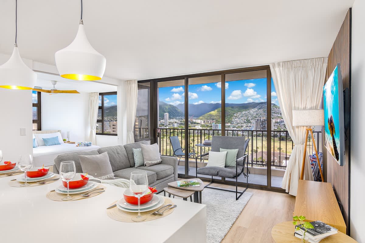 Enjoy breathtaking mountain views from your private balcony, stay connected with high-speed WiFi, and enjoy free parking! Just steps from Waikiki Beach, shops, and dining, this 26th-floor retreat sleeps up to 4 with a king bed and pull-out sofa. It also features a fully equipped kitchen and beach essentials—perfect for making the most of your paradise getaway!