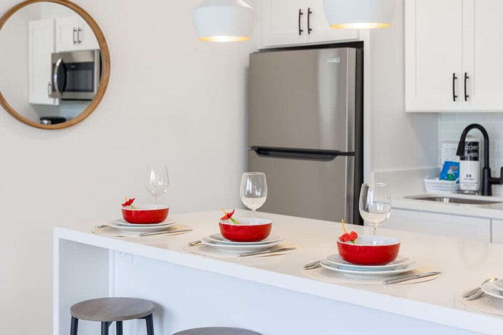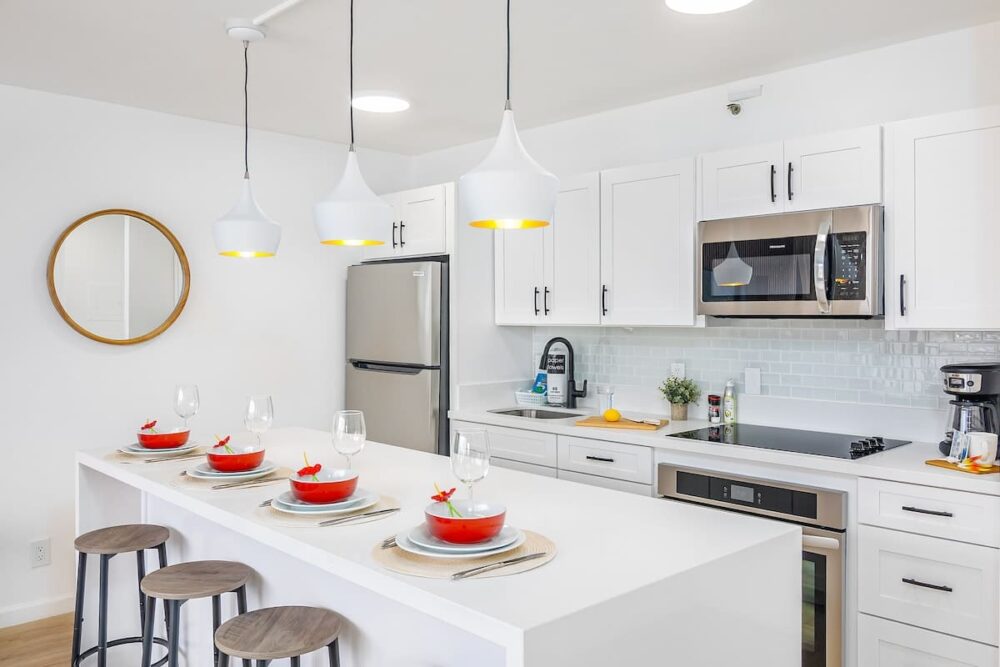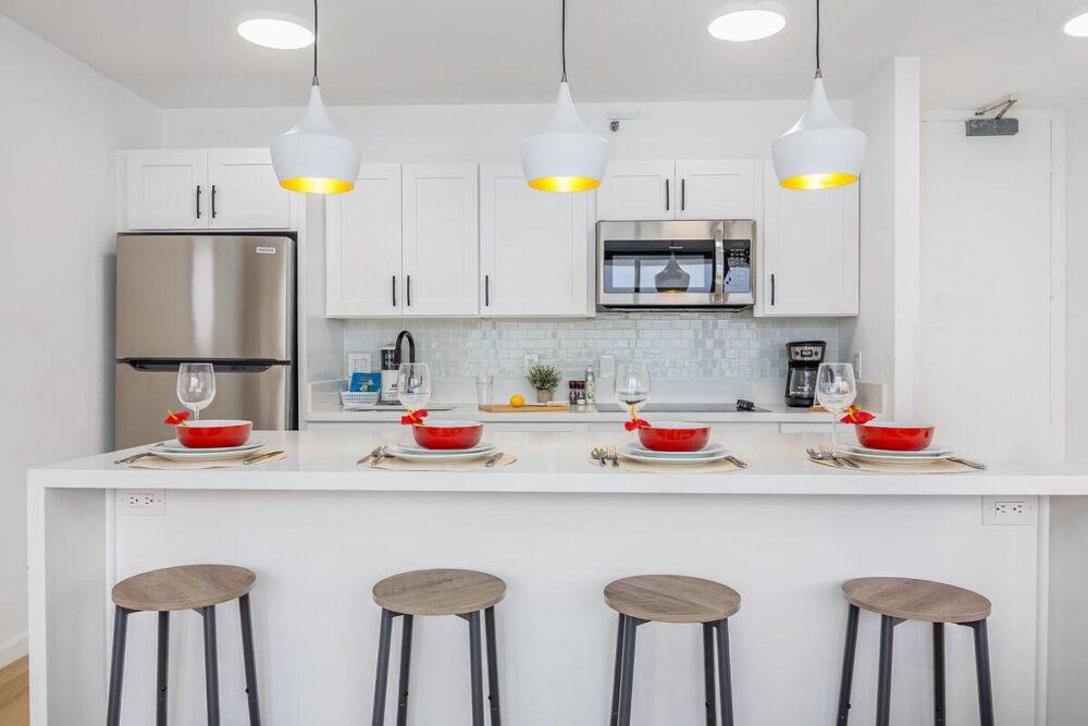 – Fully equipped kitchen with full-size appliances (microwave, stove, refrigerator with freezer; no dishwasher)