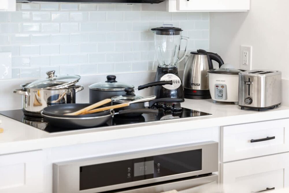 – Includes toaster, coffee maker, rice cooker, blender, kettle, pots, pans, cookware, dishes, and silverware—everything you need for home-style meals