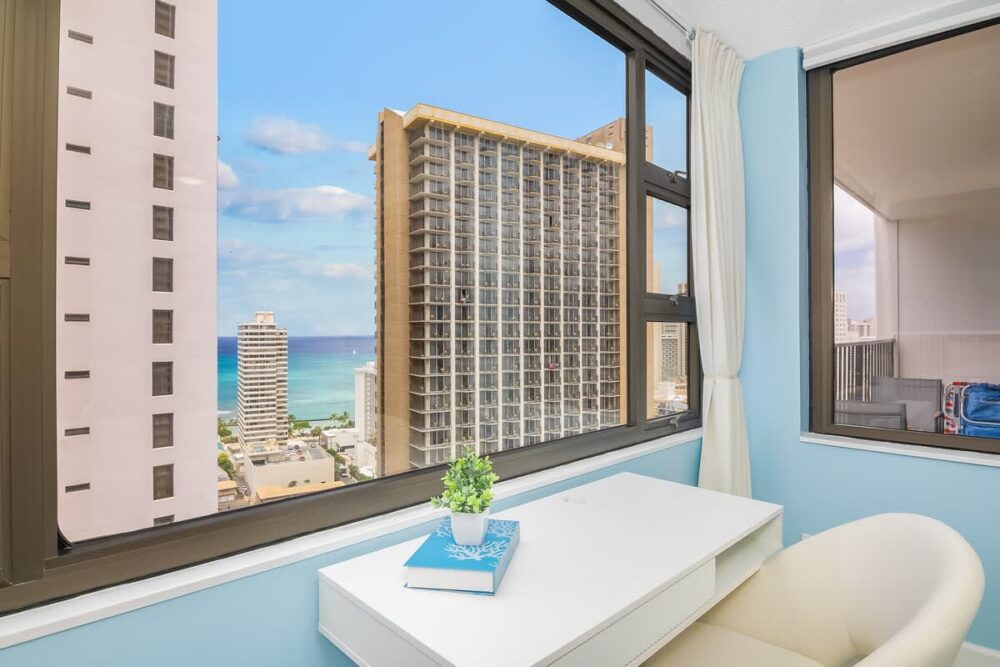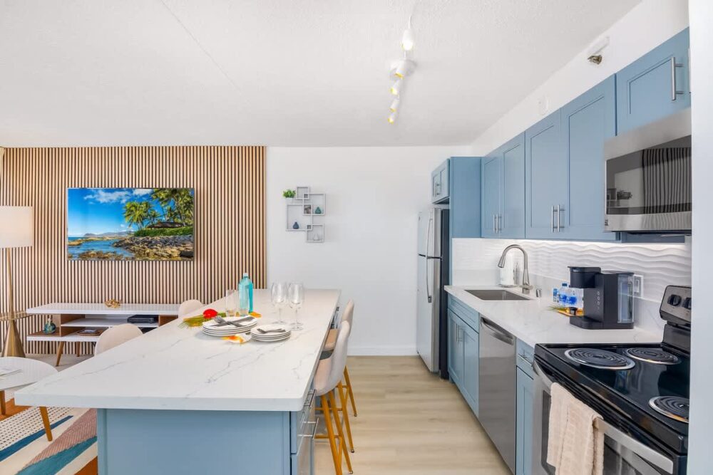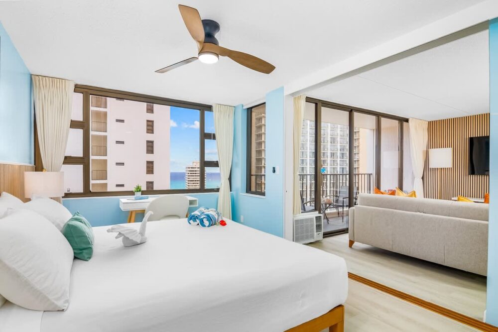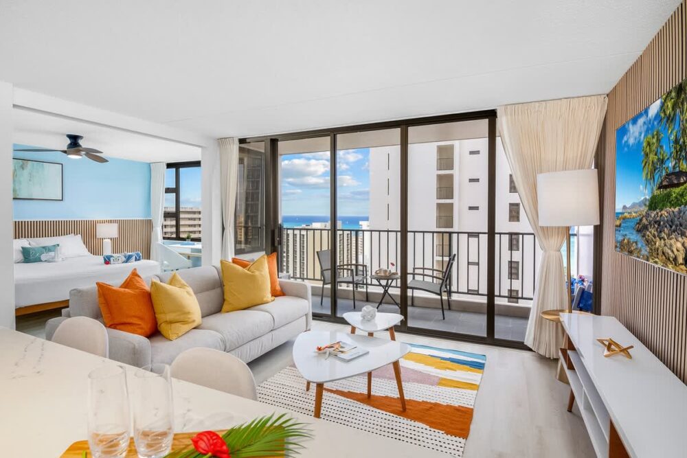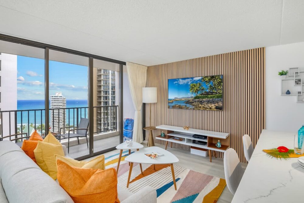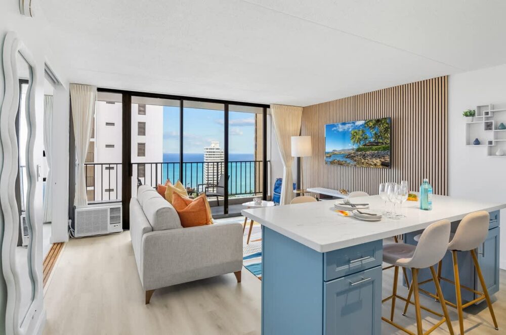 The living room features a pull-out sleeper sofa and a 65″ Samsung Smart TV, perfect for cozy movie nights with your favorite people. Enjoy your meals in the dining area, which includes 4 bar stools and offers a beautiful view of the ocean. Speaking of views, the ocean can be seen from the kitchen, living room, bedroom, and balcony, providing a breathtaking backdrop to your stay. Plus, you can refresh in your full bathroom with a walk-in shower after soaking up in the sun at Waikiki Beach.