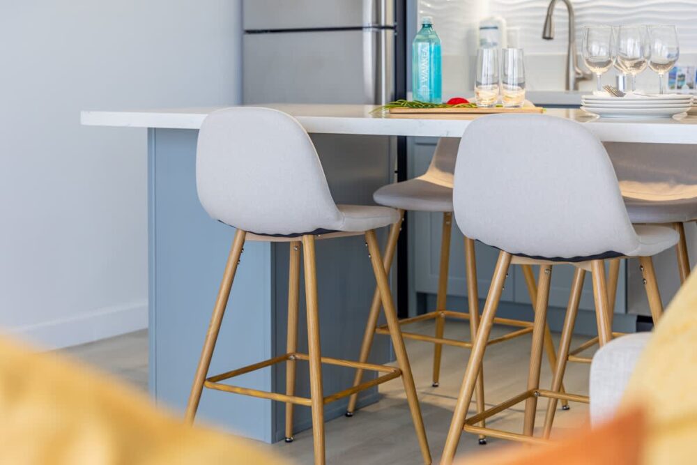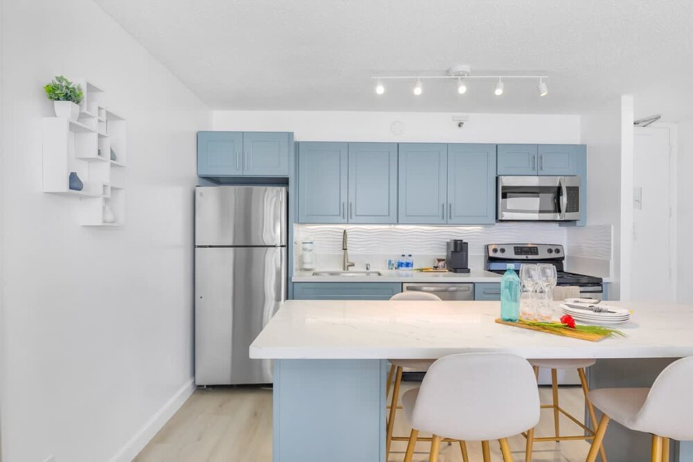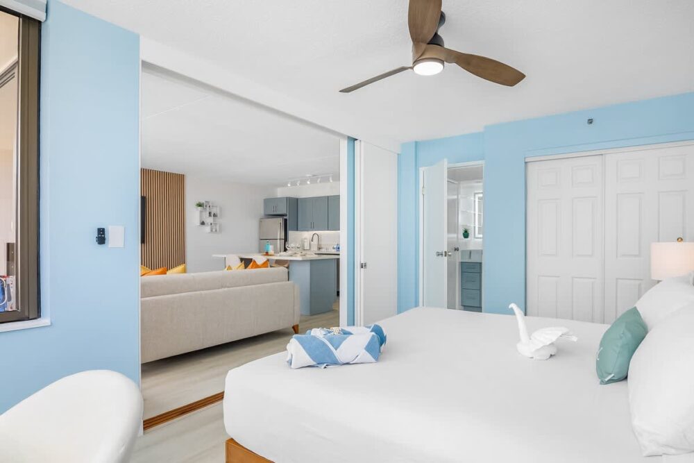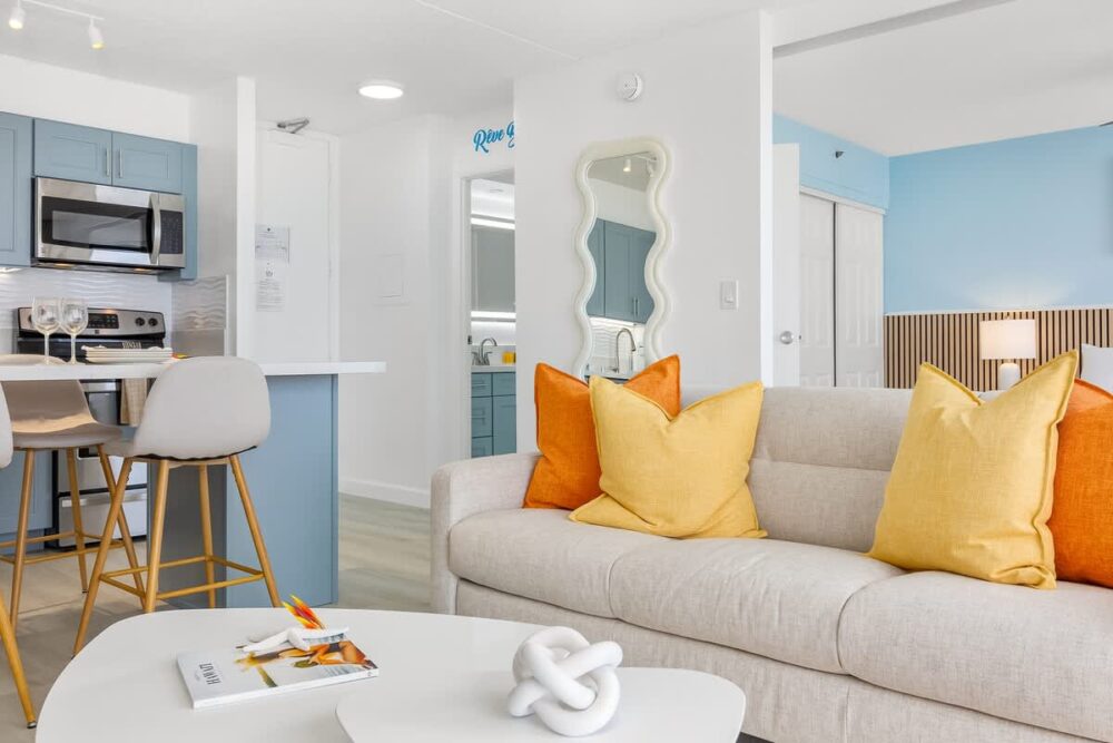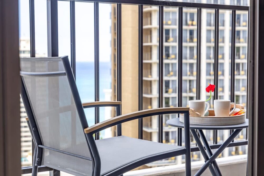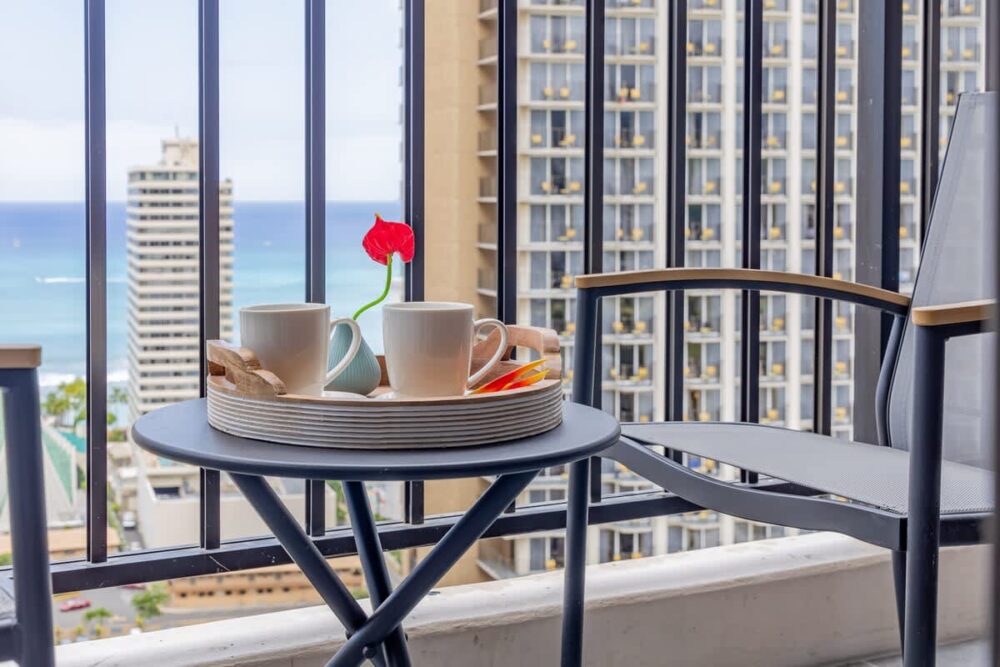 The living room features a pull-out sleeper sofa and a 65″ Samsung Smart TV, perfect for cozy movie nights with your favorite people. Enjoy your meals in the dining area, which includes 4 bar stools and offers a beautiful view of the ocean. Speaking of views, the ocean can be seen from the kitchen, living room, bedroom, and balcony, providing a breathtaking backdrop to your stay. Plus, you can refresh in your full bathroom with a walk-in shower after soaking up in the sun at Waikiki Beach.