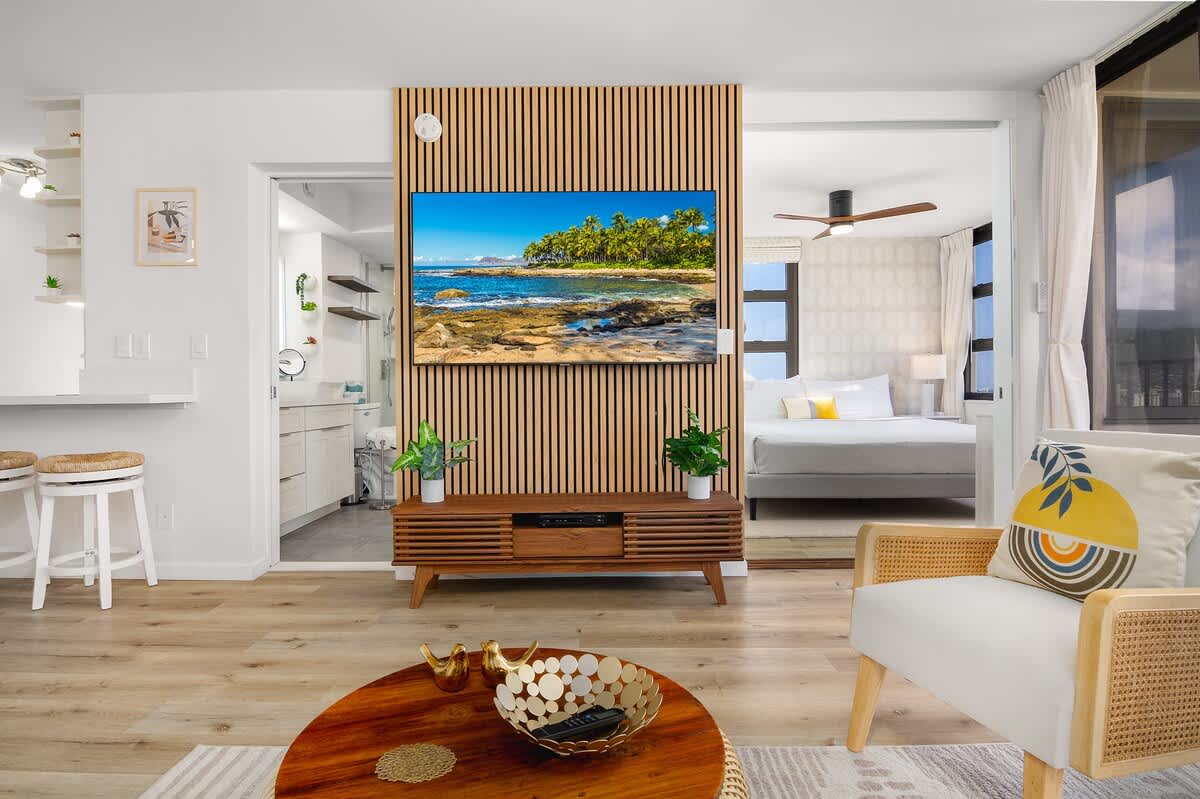 Get ready for a taste of paradise! Experience ease and allure on the 26th floor, featuring stunning ocean views. A short stroll to the beach and Hawaii's premier dining and entertainment! This charming condo at Waikiki Banyan (Tower 1) offers a southwest-facing, one-bedroom unit for 4, showcasing panoramic ocean, city, and mountain views from the private lanai. With air conditioning, a fully equipped kitchen, and a chic dining area for 4, it seamlessly combines convenience with sophistication. The King-size bed in the bedroom with a 43" Smart TV and the living room with a 65" Smart TV add a touch of luxury. Revel in a full bathroom with a modern walk-in shower, completing your refined and fascinating retreat.