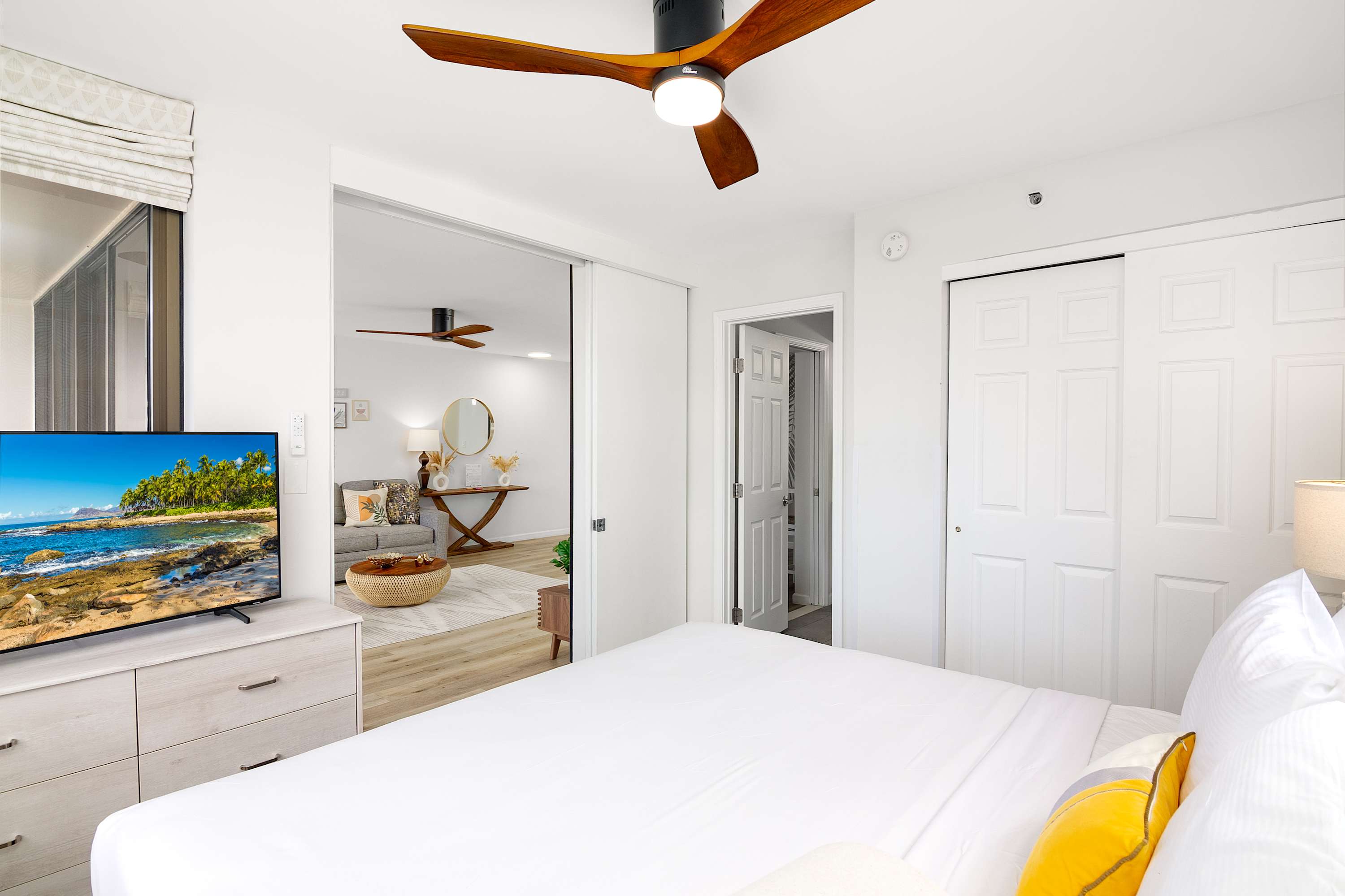 The bedroom is set apart by a sliding door and features a king-size bed, ceiling fan, and a 43-inch Smart TV. Storage space, linens, and extra pillows and blankets support both short and extended stays. The bathroom, accessible from both the bedroom and living area, includes a walk-in shower and bathroom essentials for daily routines.