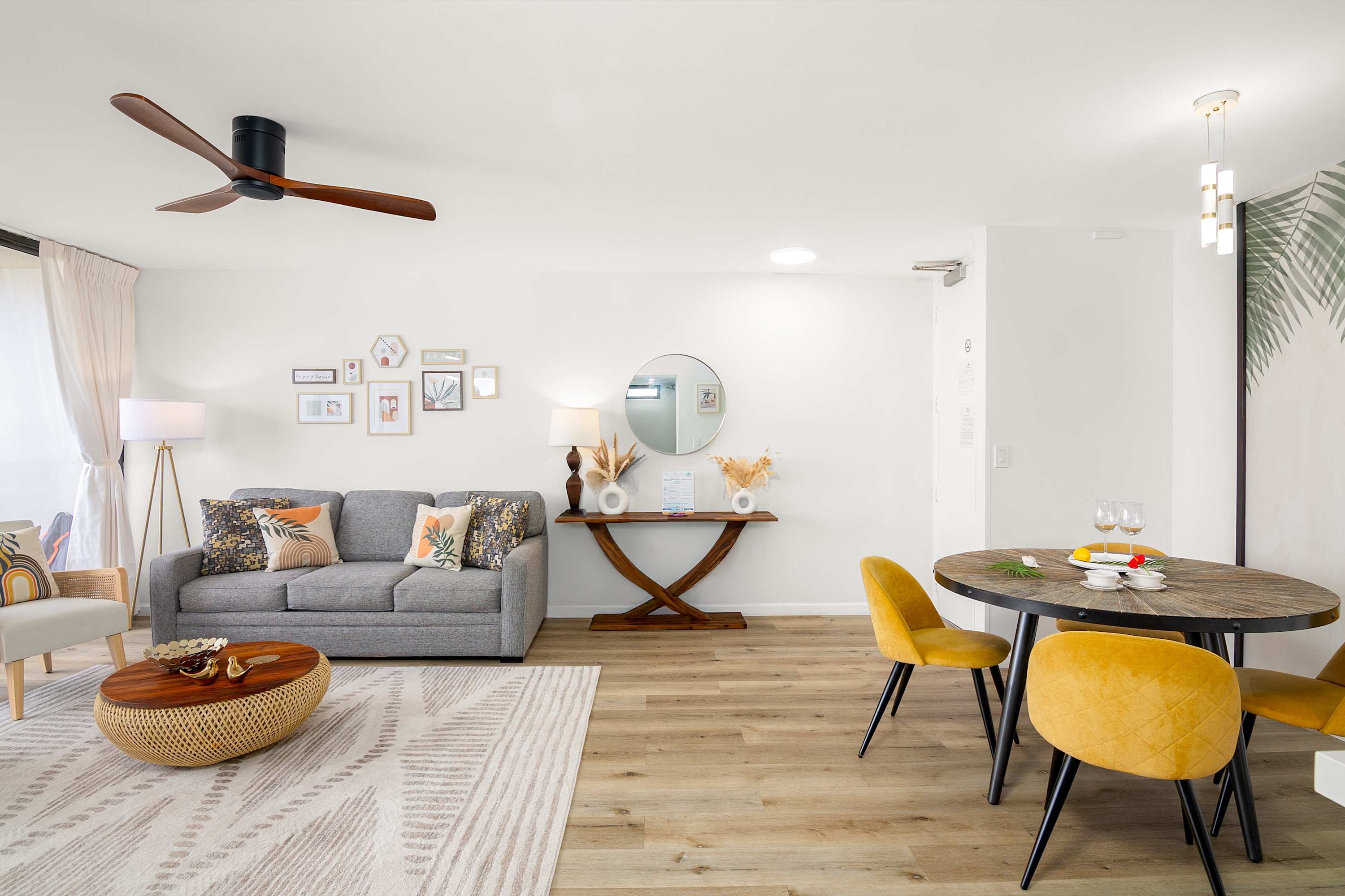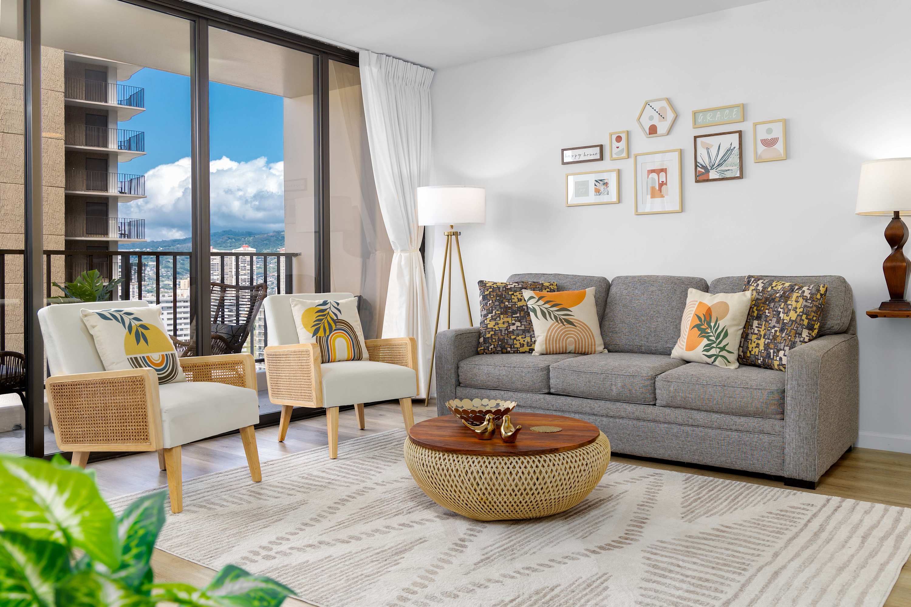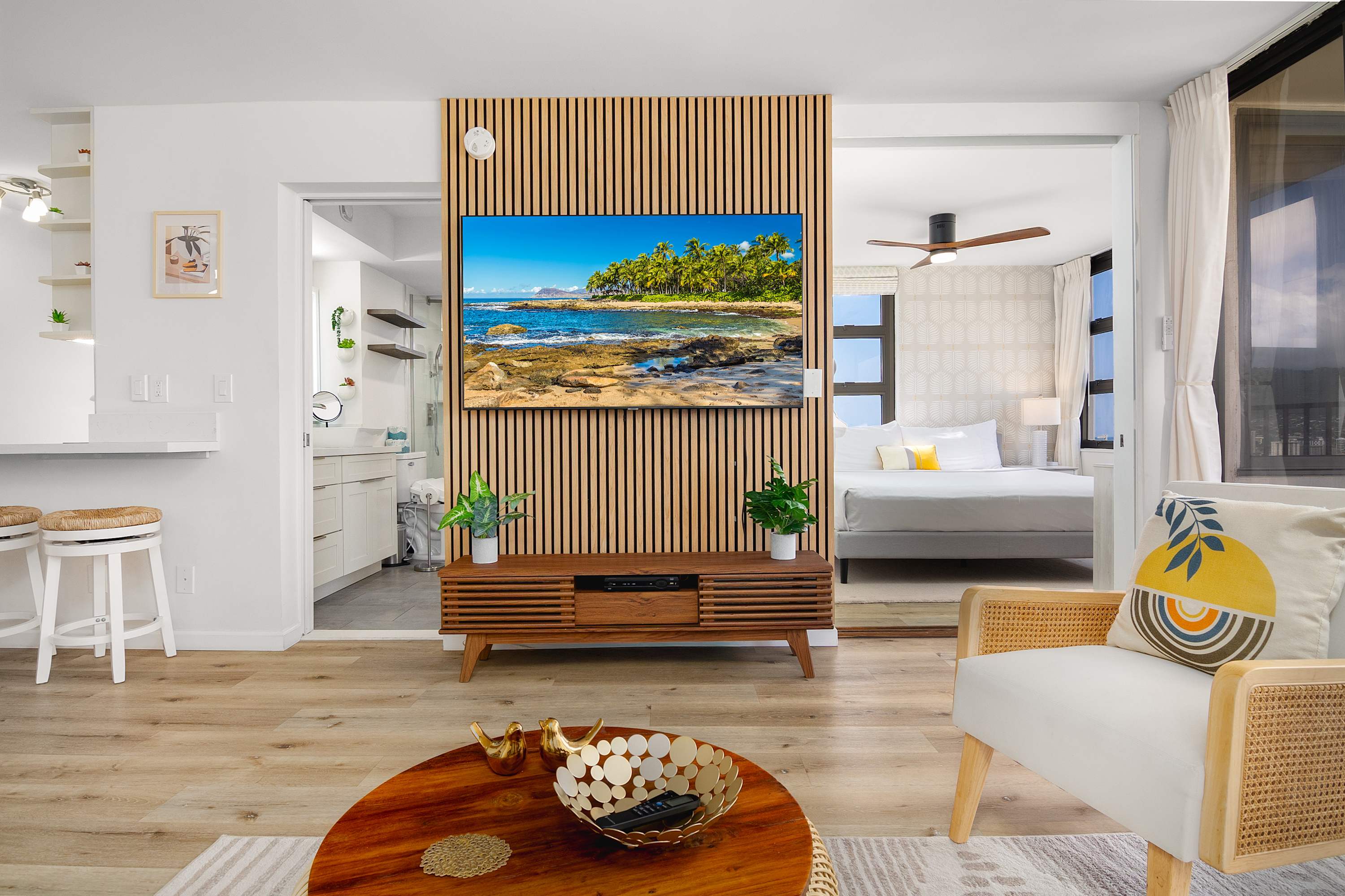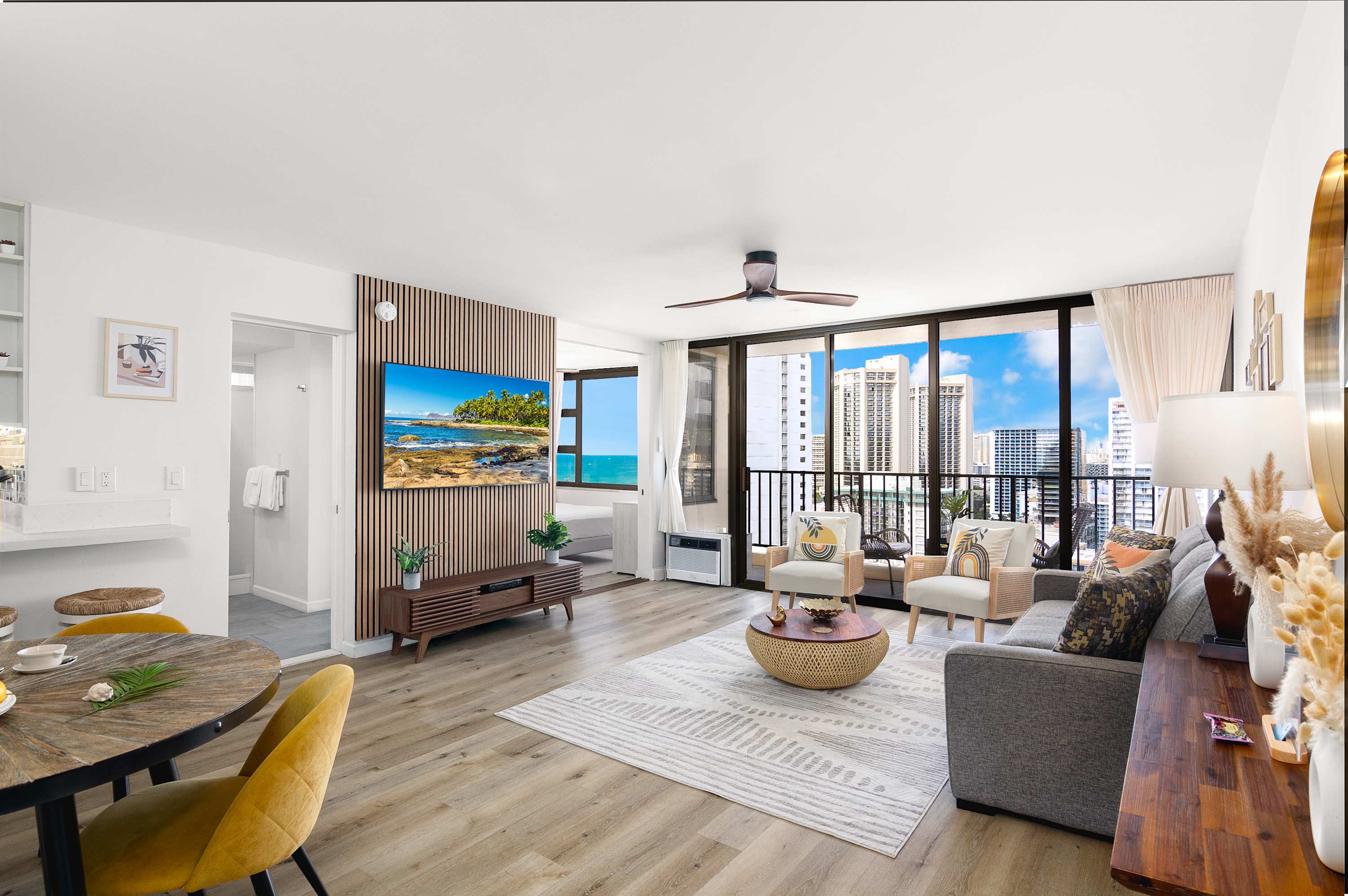 The living room offers a relaxed place to recharge between outings, with a pull-out sleeper sofa and a 65-inch Smart TV for easy downtime. Large windows keep the ocean and skyline in view, while air conditioning and room-darkening shades help maintain comfort throughout the day. The open layout connects seamlessly to the rest of the space, making it easy to move between lounging, dining, and the lanai.