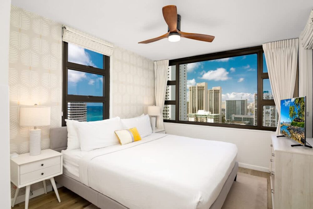 Get ready for a taste of paradise! Experience ease and allure on the 26th floor, featuring stunning ocean views. A short stroll to the beach and Hawaii’s premier dining and entertainment! This charming condo at Waikiki Banyan (Tower 1) offers a southwest-facing, one-bedroom unit for 4, showcasing panoramic ocean, city, and mountain views from the private lanai. With air conditioning, a fully equipped kitchen, and a chic dining area for 4, it seamlessly combines convenience with sophistication. The King-size bed in the bedroom with a 43″ Smart TV and the living room with a 65″ Smart TV add a touch of luxury. Revel in a full bathroom with a modern walk-in shower, completing your refined and fascinating retreat.