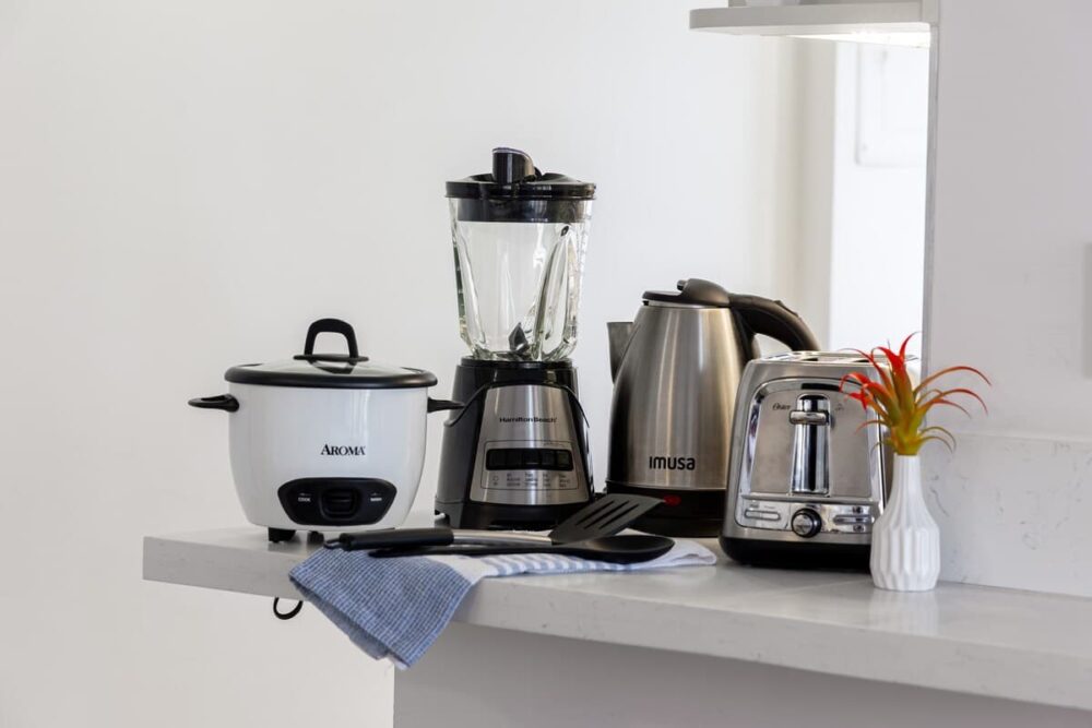 – It also comes with a toaster, coffee maker, rice cooker, blender, kettle, pots, pans, silverware, cookware, and dishes.