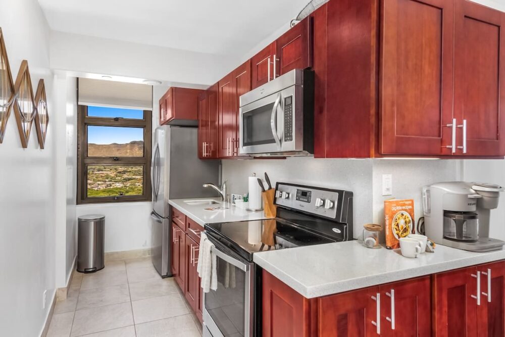 For your convenience and comfort, this unit is fully air-conditioned with a window AC, and the fully equipped kitchen features panoramic views of Diamond Head to the east.