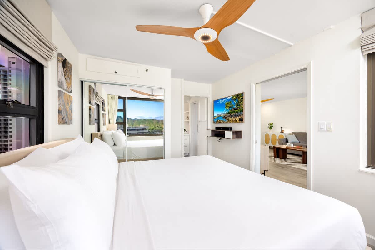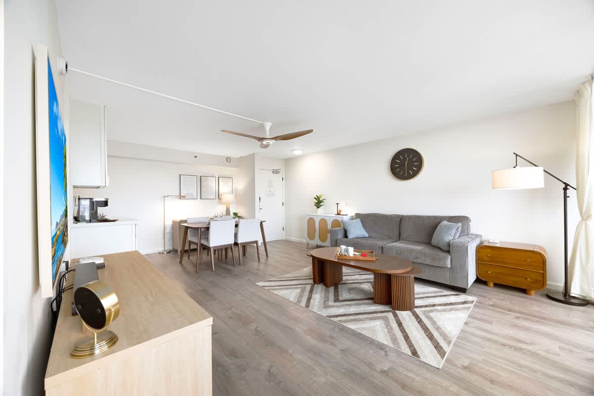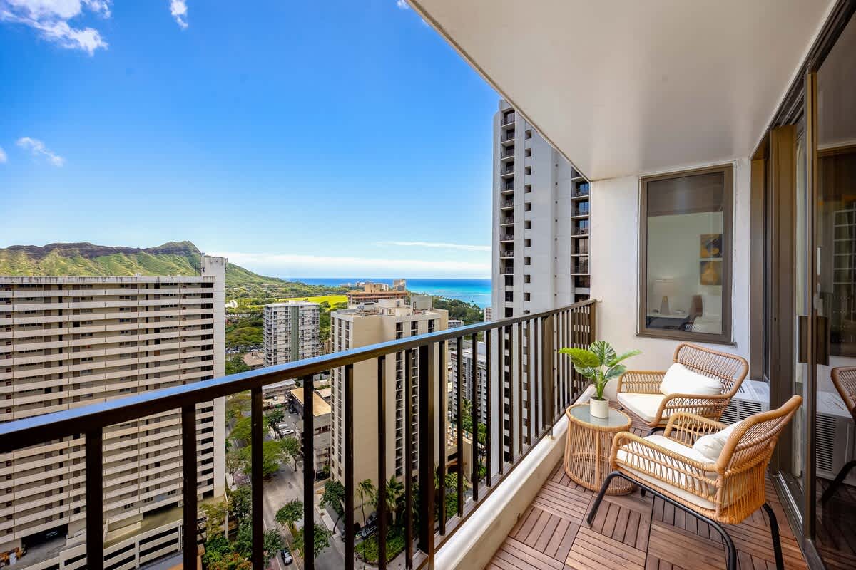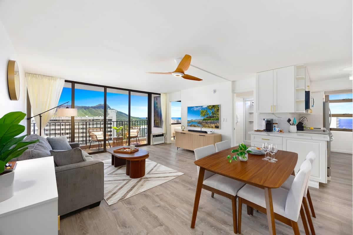 Luxurious Waikiki Escape! Just 1 block from Waikiki Beach, this upscale, fully remodeled corner condo at the Waikiki Banyan features breathtaking ocean and Diamond Head views. Relax in style with a plush king bed, sleeper sofa, and private lanai. Includes free parking, high-speed Wi-Fi, and a prime location near world-class shopping, dining, and Waikiki’s best attractions. Sleeps up to 4.