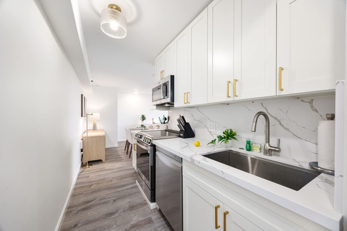 – Kitchen with full-size appliances: microwave, stove, refrigerator with freezer, dishwasher