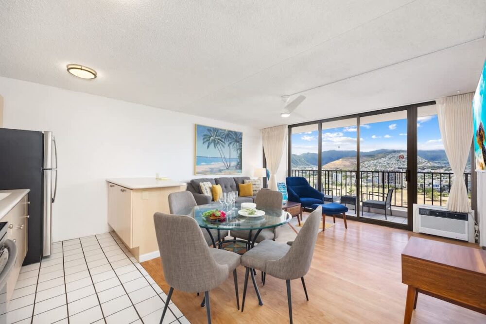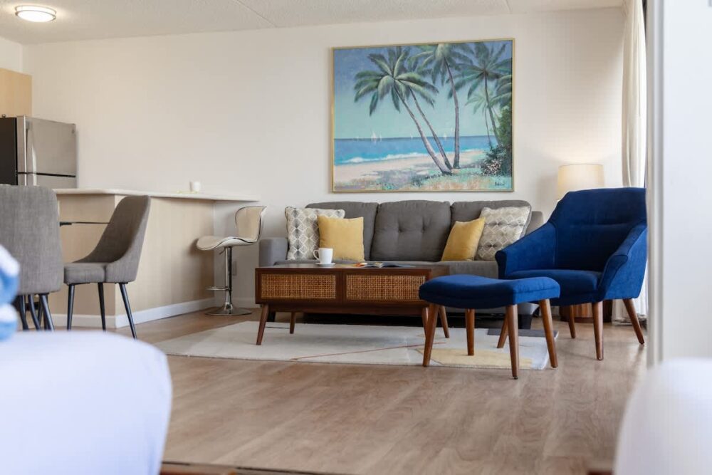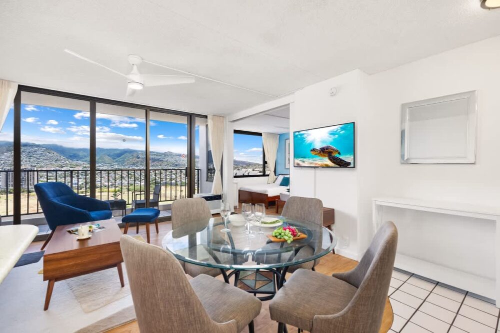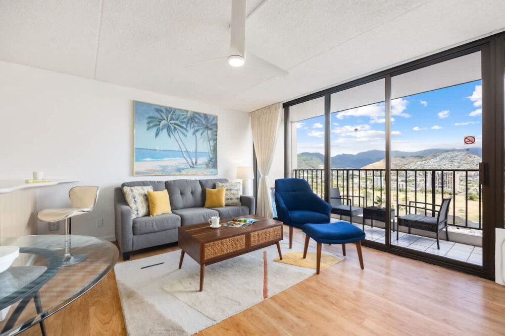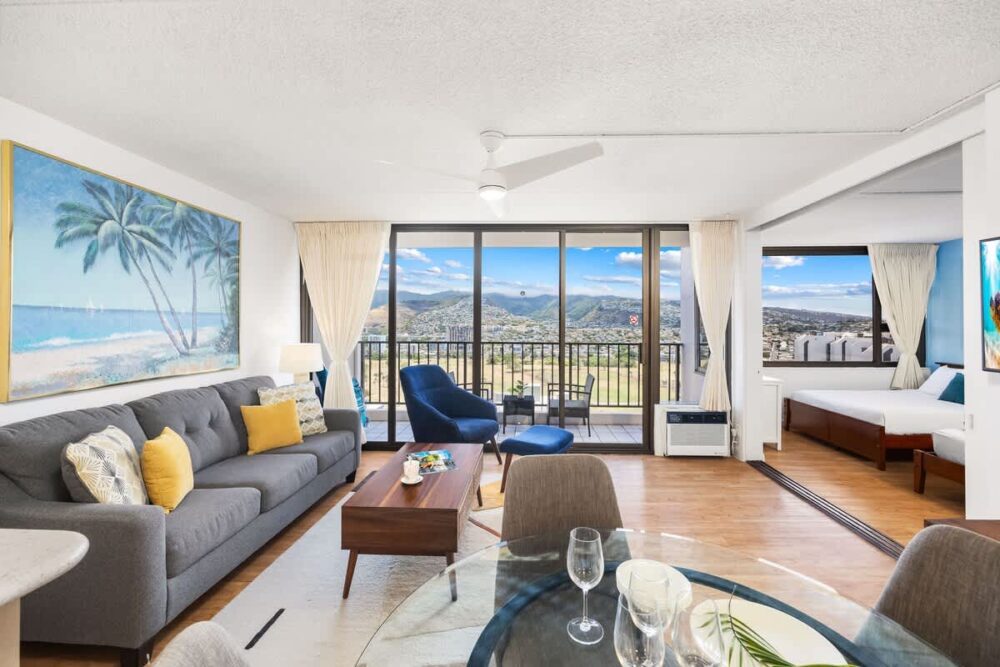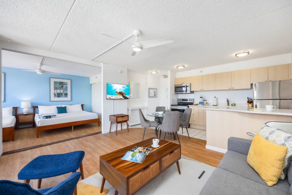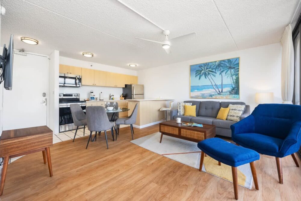 Escape to our 28th-floor 1BR, where breathtaking mountain views meet the vibrant energy of Waikiki. Just steps from the beach, shops, and restaurants, this home-away-from-home sleeps up to 6 with a king and full bed, plus a pull-out sleeper sofa. Enjoy free high-speed WiFi, A/C, parking, a 42″ smart TV, and a fully equipped kitchen—perfect for relaxing after your island adventures!