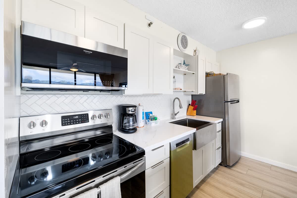 – Kitchen with full-size appliances: microwave/rangehood, stove, refrigerator with freezer.