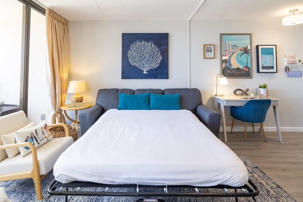 To keep you cool and comfortable, this unit is fully air-conditioned with a window AC. The kitchen, fully equipped for your culinary delights, boasts panoramic views of the majestic Diamond Head to the east. In the living room, you’ll find a comfy pullout sleeper sofa, a 42” LG Smart TV, a ceiling fan, and a dining table for up to four. Meanwhile, the bedroom spoils you with a king-size bed and its own ceiling fan, ensuring your absolute relaxation. And let’s not forget the full bathroom, featuring a walk-in shower with a refreshing rain shower head and a handy handheld shower wand to wash away the day’s adventures.
