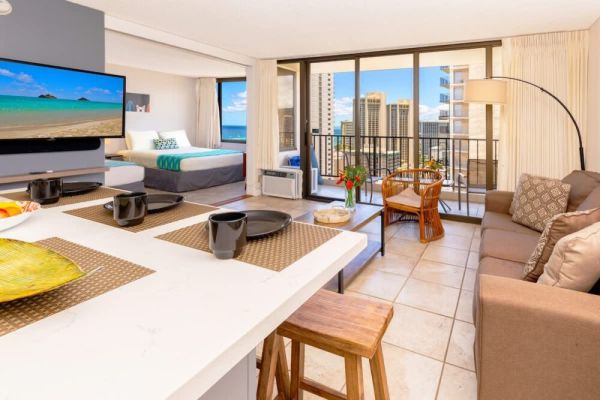 Gorgeous 1-bedroom suite located in the Condominium Hotel Waikiki Banyan, accommodating up to 4 guests brought to you by Midway Vacations. This conveniently situated unit offers a short stroll to the picturesque Waikiki Beach, as well as a variety of shopping and dining options. Additionally, it includes complimentary parking and a high-speed wireless internet connection. Enjoy captivating views of both the ocean and the majestic mountains from this exquisite retreat!