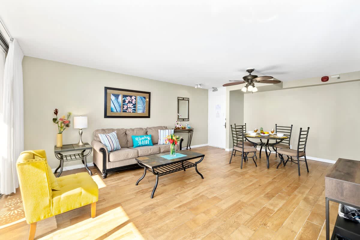 Really enjoyed this listing, be prepared the location is downtown so at times it can be loud at night, but we weren’t bothered by it! We could walk anywhere in Waikiki from the listing, great restaurants so close and if driving from downtown easy access to the roads/highway. The bedroom, living room area were comfy and spacious. The kitchen was good- if you plan to cook, buying spices and getting Tupperware or something similar as it will be needed. And the knives could use an upgrade, they were pretty beaten up (one had a total notch taken outta it and the other was a little rusty) those smaller things didn’t bother us, we’d definitely stay here again! Friendly and helpful hosts