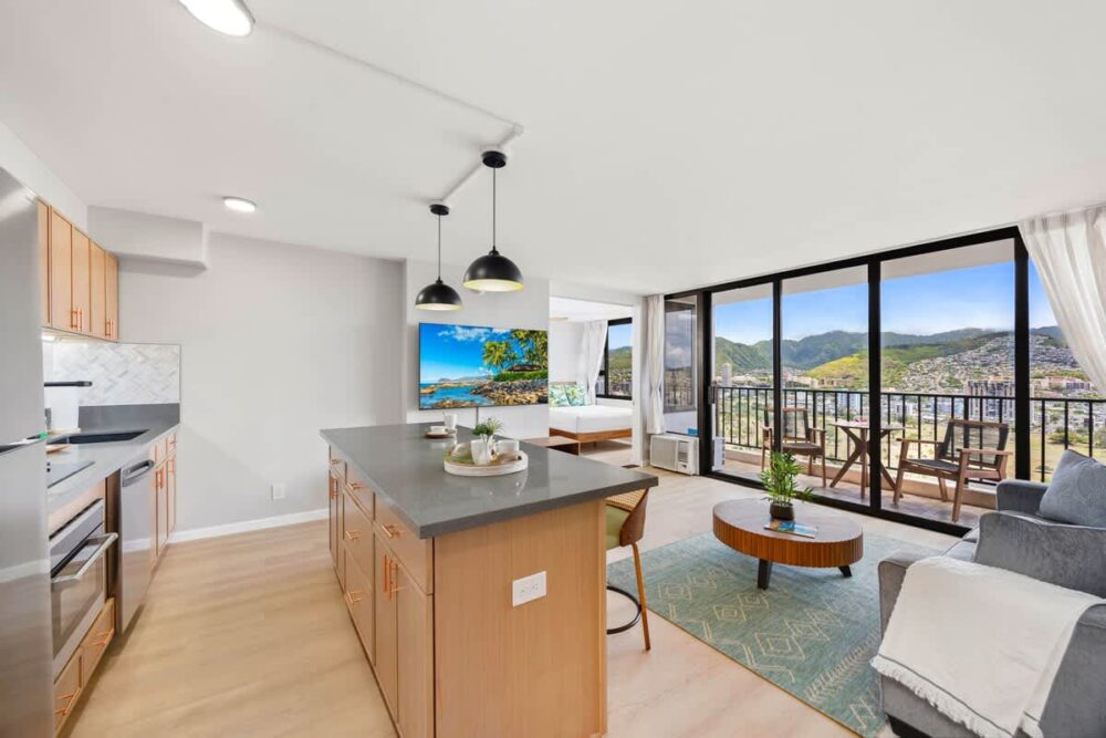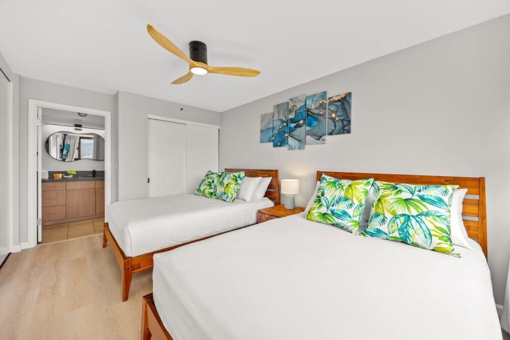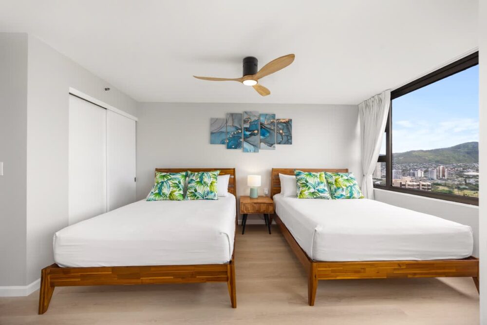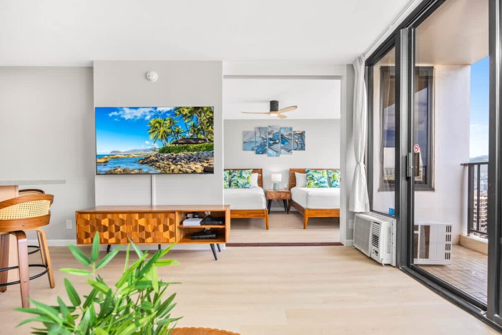 Enjoy your tropical getaway in this beautifully renovated 600 sq ft 1-bedroom condo for up to 4 guests at Waikiki Banyan (Tower 2), set in the heart of Waikiki. Perched on the 30th floor, the unit offers sweeping mountain and city views from the living room, bedroom, and private balcony, plus an easy stroll to Waikiki Beach. Inside, enjoy an open layout with a full kitchen, dining for 4, 2 queen beds, a sleeper sofa, a window AC, and a modern bath, making it a perfect base for a relaxing island stay!