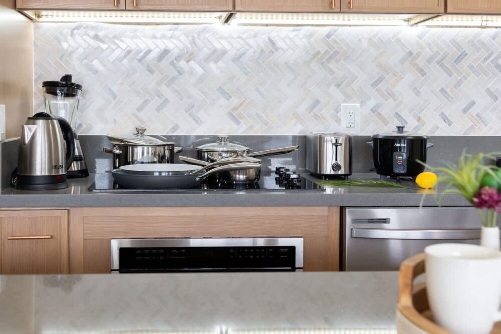 • Fully equipped with a toaster, coffee maker, rice cooker, blender, kettle, pots, pans, silverware, cookware, and dishes.