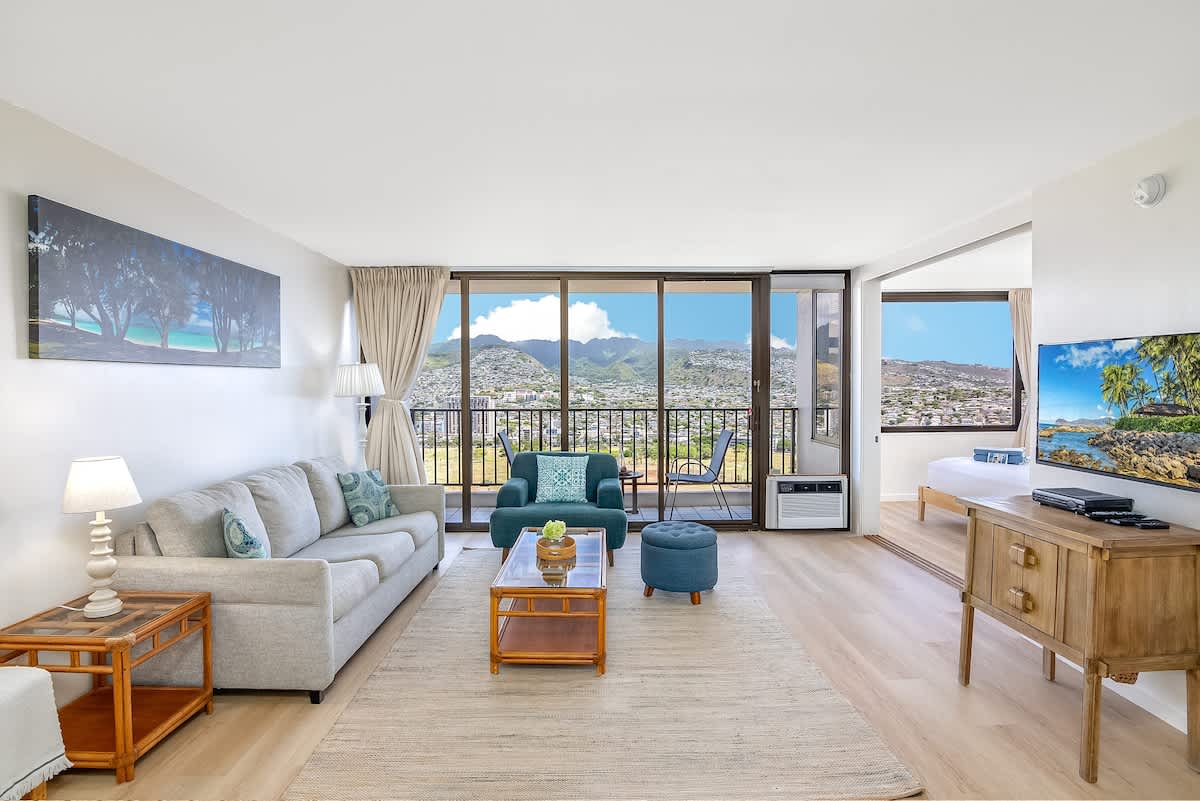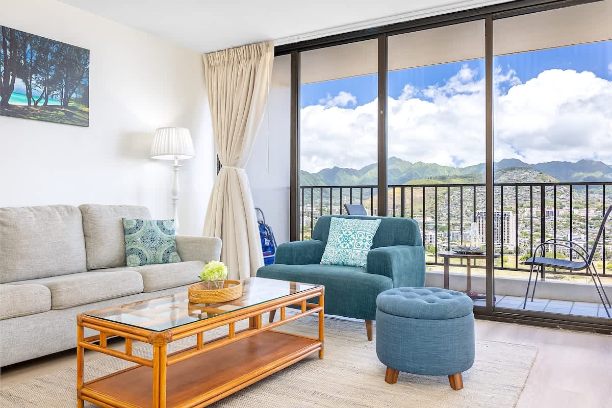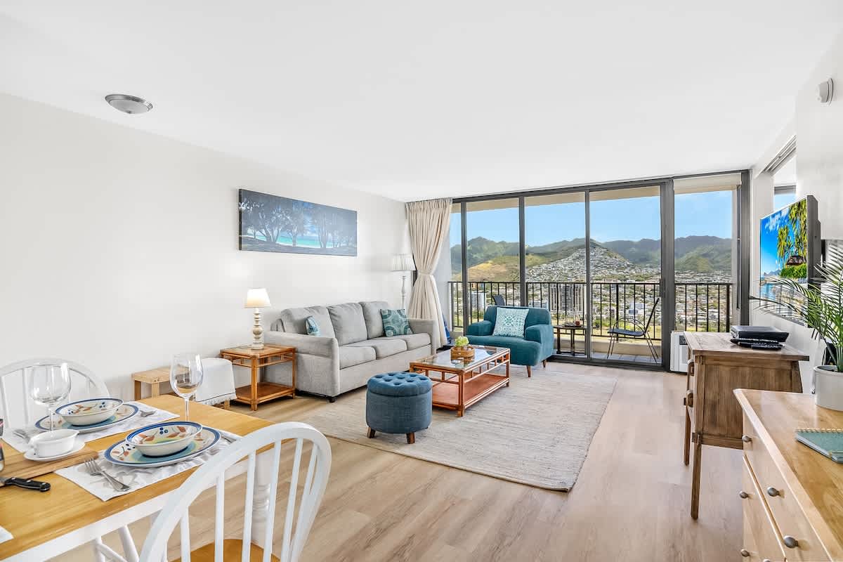 Elevate your vacation in this exceptionally private and quiet condo that offers unobstructed views of the majestic mountains and the vibrant cityscape of Honolulu. Additionally, the sparkling Pacific Ocean and iconic Diamond Head can be seen from the kitchen window.