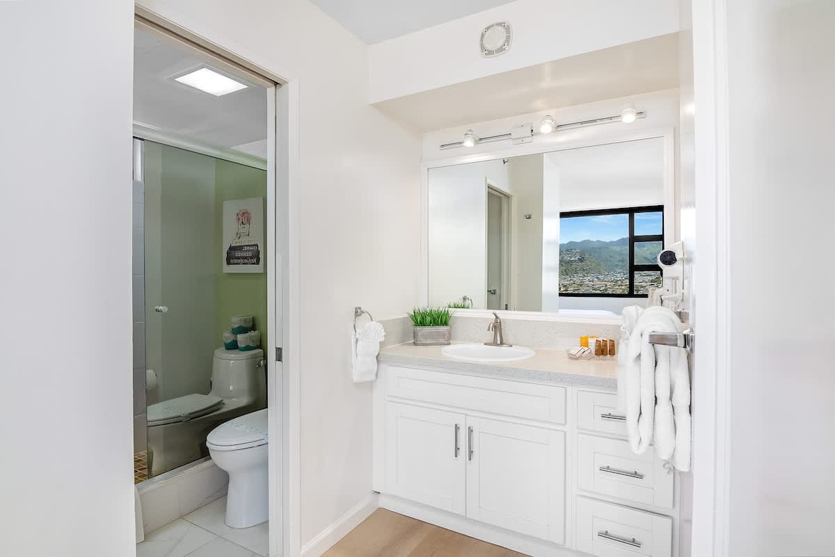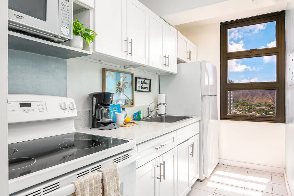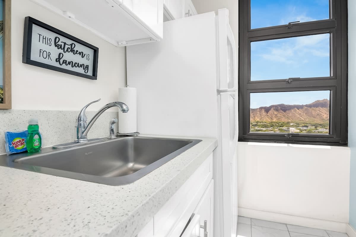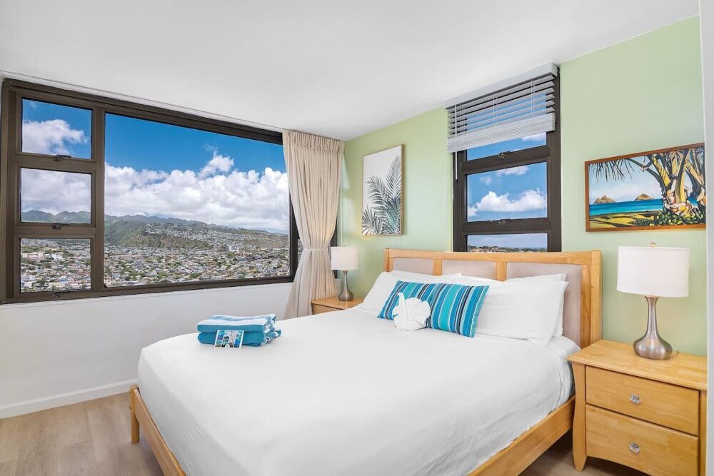 Elevate your vacation in this exceptionally private and quiet condo that offers unobstructed views of the majestic mountains and the vibrant cityscape of Honolulu. Additionally, the sparkling Pacific Ocean and iconic Diamond Head can be seen from the kitchen window.