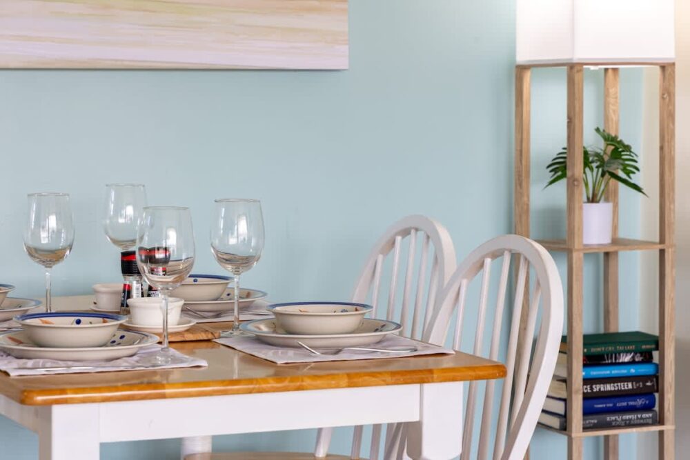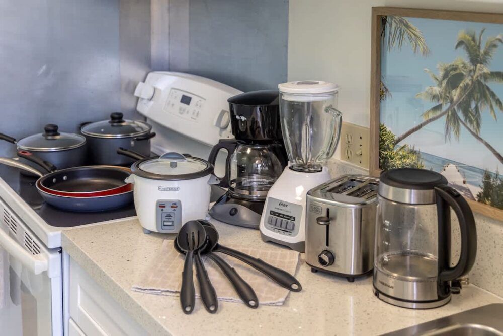 – Fully equipped with a toaster, coffee maker, rice cooker, blender, kettle, pots, pans, silverware, cookware, and dishes.