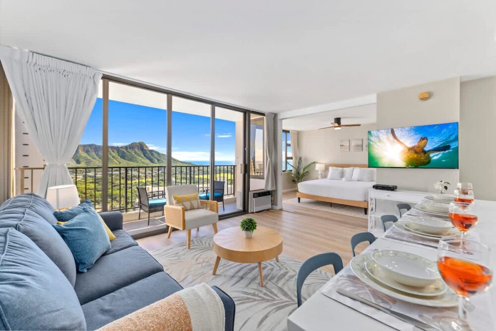 Get ready for an unforgettable taste of paradise! Discover this newly renovated apartment, a cozy condo suite nestled in the family-friendly Waikiki Banyan (Tower 1), just a block away from some of the world’s most renowned waves! Situated on the 33rd floor facing southeast, relish stunning Diamond Head and ocean views right from your living room, bedroom, and balcony!
