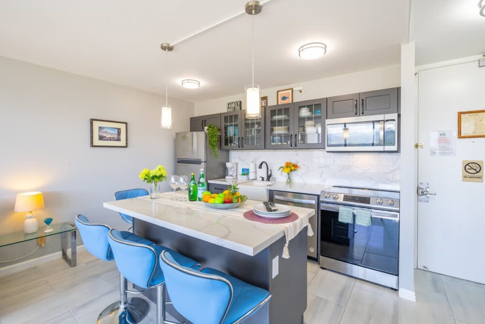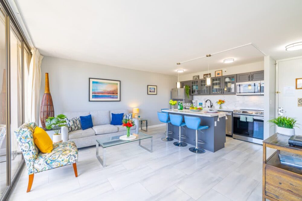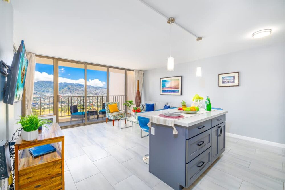 Perched on the 34th floor, this apartment boasts breathtaking mountain and city views, visible from the living room, bedroom, and balcony. The best part? It’s just a stroll away from the world-famous Waikiki Beach – an unparalleled location for an unforgettable vacation.